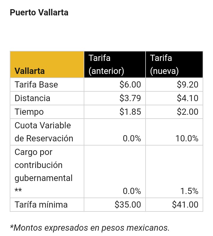 La tarifa mínima en Guadalajara será de $25.00 MXN y en Puerto Vallarta de $35.00 MXN más un incremento en el costo por tiempo y distancia. En Puerto Vallarta, también se agregará la cuota de reservación variable de 10% que ya tiene la capital y la cual sustituye a la cuota de reservación fija.