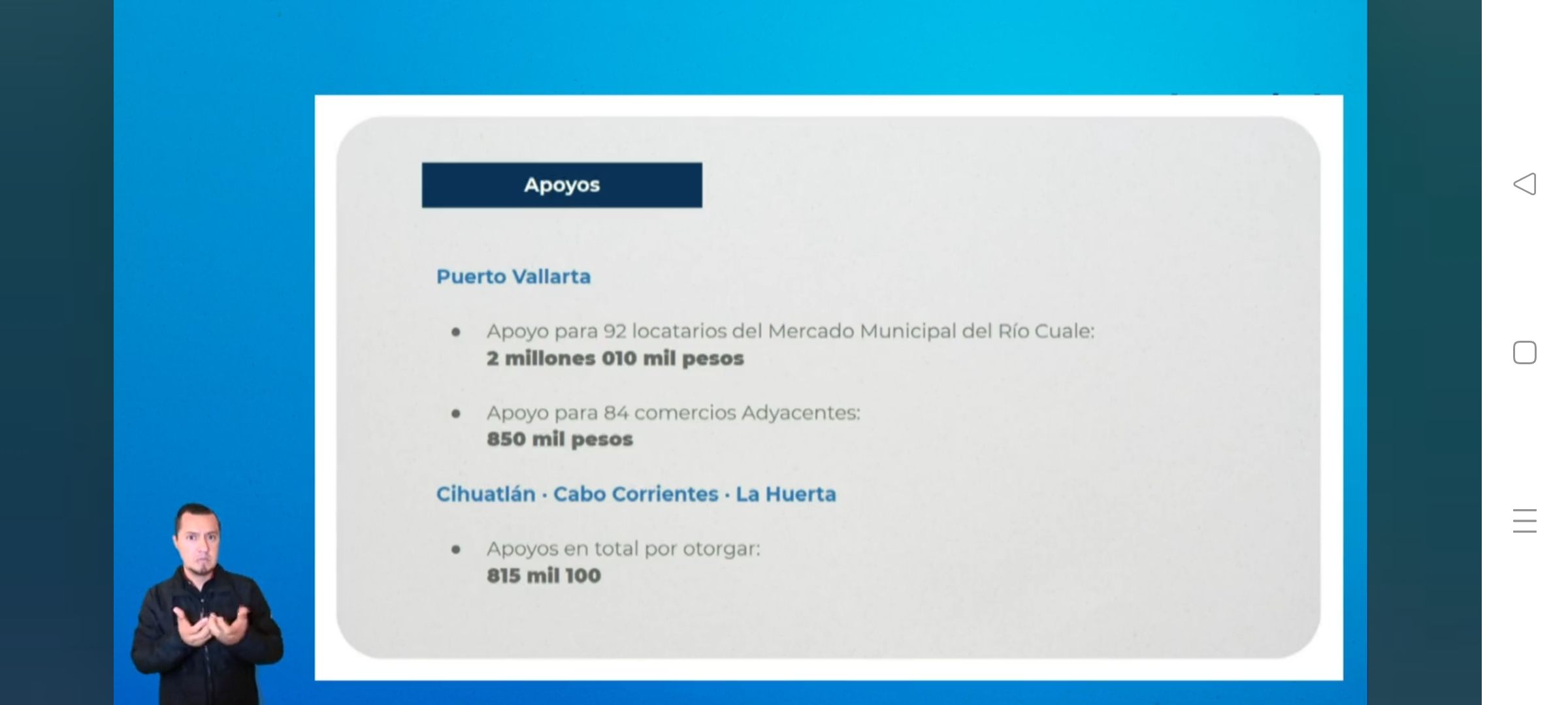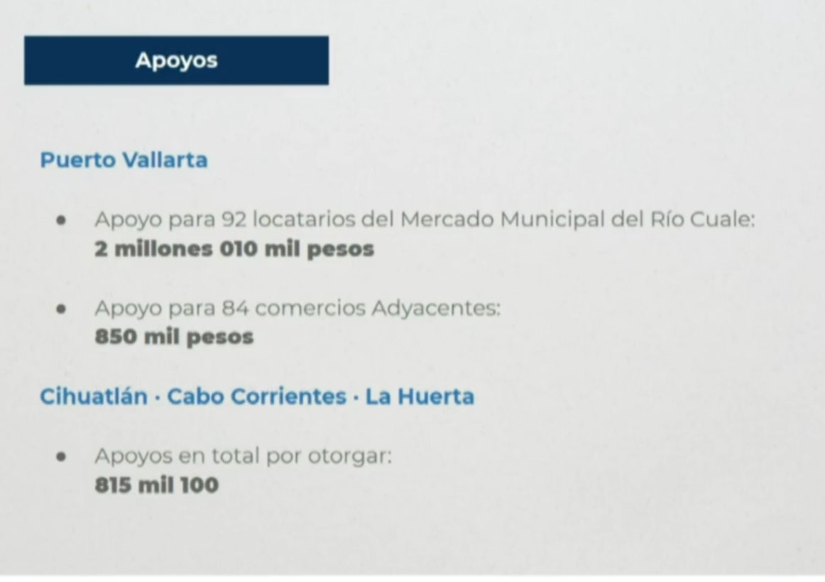 También se entregarán 850 mil pesos para 84 comercios adyacentes de esa zona en Puerto Vallarta. Para Cabo Corrientes, La Huerta y Tomatlán en este mismo rubro la ayuda será por 815 mil 100 pesos.