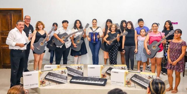 Diez guitarras, cuatro teclados y un acordeón fue lo que recibieron de manos de la alcaldesa Mirtha Villalvazo, los primeros alumnos de esta clase, quienes previamente presentaron un avance de sus clases mediante una canción con dedicatoria para la presidente.