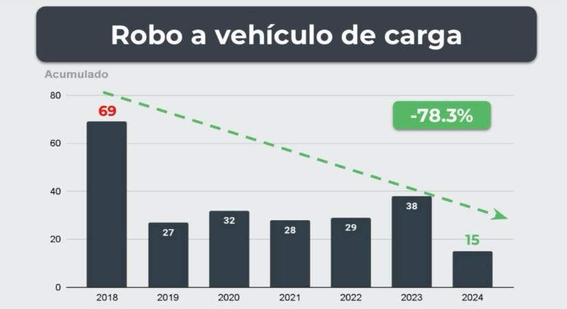 Precisa que en mismo lapso de 2018, de la pasada administración, reportaron 69 hurtos a transportistas, mientras que en el corte anual de 2023, los números llegaron a 246, contrastando con 670 de hace seis años. El robo a vehículos de carga pesada, forma parte de los delitos de seguimiento especial, de ahí que se requiere mayor patrullaje en zonas de prevalencia, tales como pasos informales carreteros, utilizados por la delincuencia.