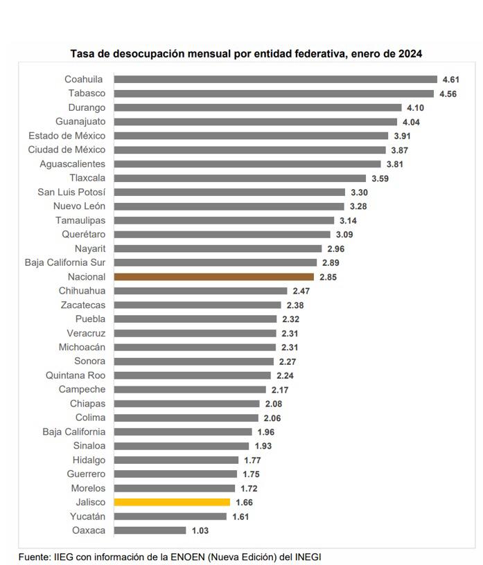 Indica que tal cifra, es la más baja para un enero desde 2006, ubicando a Jalisco, en el tercer mejor posicionado por este rubro, a nivel nacional. Indica que la media, se sitúa en el 2.85 por ciento, toda vez que el Estado con mayor desocupación laboral, es Coahuila, seguido de Tabasco, Durango, Guanajuato, Estado de México y Ciudad de México.