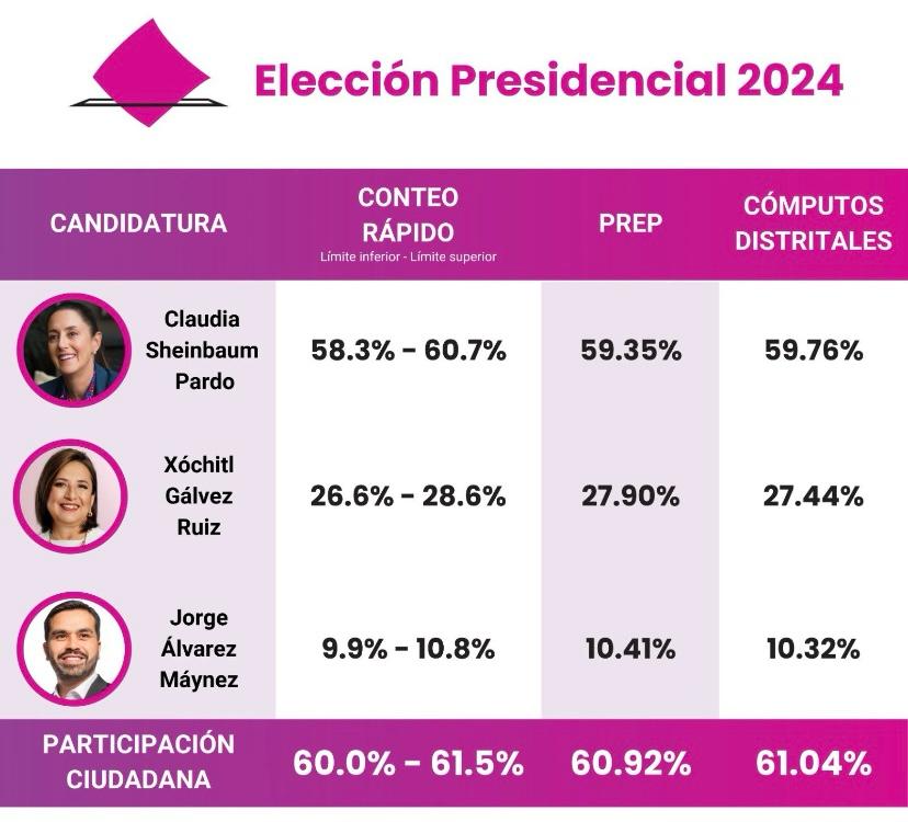 Tras concluir, este jueves 06 de junio, el cómputo de las actas en los 300 Distritos Electorales del país, después de lo arrojado por el PREP, el lunes pasado, producto de la jornada del domingo 02 de junio, quedó ratificado, con 35 millones 923 mil sufragios, o 59.7 por ciento de la votación general, el triunfo de Claudia Sheinbaum Pardo, candidata de Morena y partidos aliados, a la Presidencia, que asumirá el primero de octubre próximo, confirma delegación del INE Jalisco.