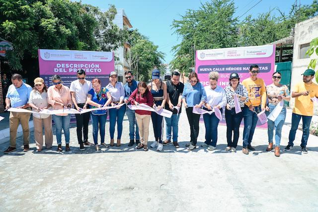 En Bucerías, la presidenta municipal cortó el listón inaugural de la nueva calle Héroes Nayaritas, localizada entre las vialidades Melchor Ocampo y Héroes de Nacozari. Esta nueva calle, que tuvo un costo cercano a los 2 millones y medio de pesos, fue hecha en empedrado ahogado en mortero en una superficie de más de 700 metros cuadrados, se financió a través de un fondo de obra directo y el beneficio será para más de 16 mil personas.