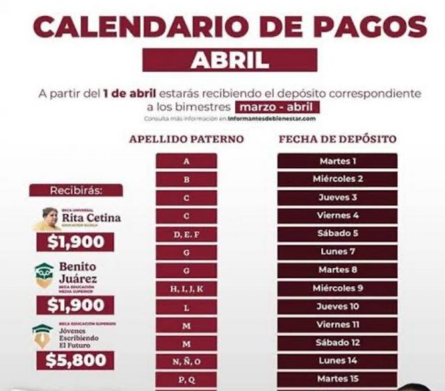 Precisa que desde este pasado nueve de abril, iniciaron la entrega que finalizará en la primera semana de mayo. Por otro lado, asegura que avance de 50 por ciento en la dotación de la “Beca Rita Cetina” para 230 mil estudiantes de secundarias, que previamente se registraron para obtener este otro respaldo, el cual también es de mil 900 pesos bimestrales, aunque se añaden 700 pesos por cada uno de los hermanos adicionales, que cursen el mismo nivel de instrucción.