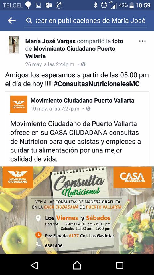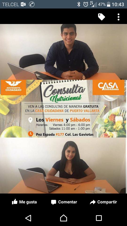 También da consultas de nutrición en la Casa Ciudadana de Movimiento Ciudadano los viernes a partir de las 5 de la tarde y sábados en la mañana hasta la 1 pm.