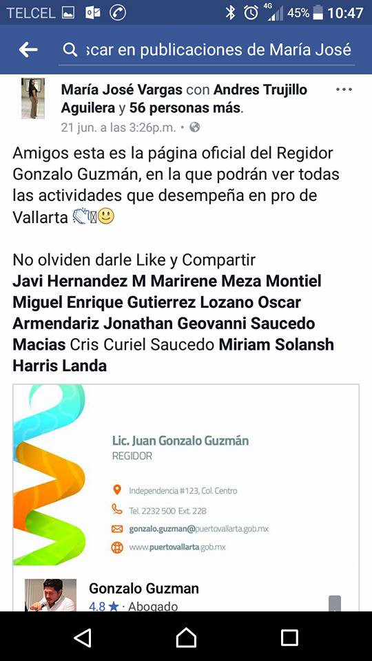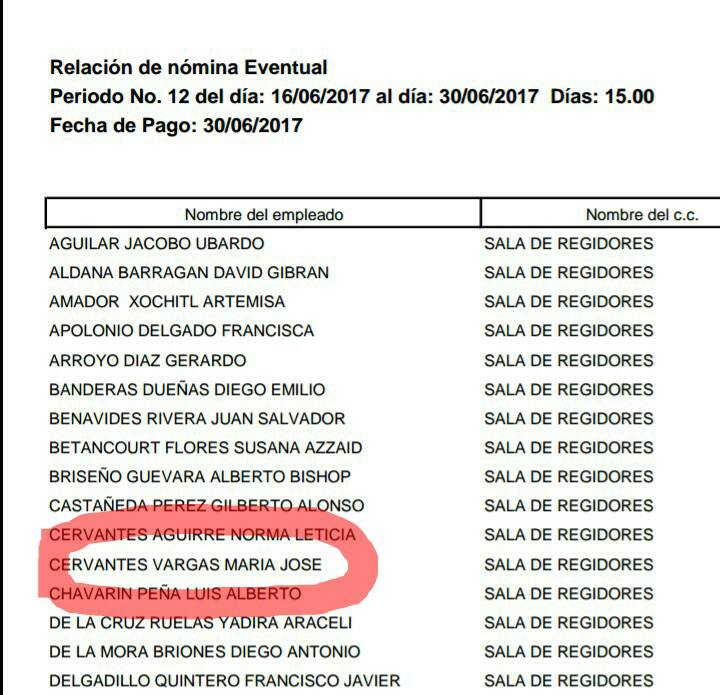 Desde el 1° de marzo de este año María José Cervantes Vargas ingresó a la nómina municipal con el cargo de auxiliar de regidor y un sueldo de 7 mil 800 pesos mensuales. Las secretarias no la conocen. A través de su cuenta de facebook, comparte actividades y las iniciativas con el edil Gonzalo Guzmán de Movimiento Ciudadano,al igual que eventos del partido. El horario oficial para trabajadores municipales es de 8 am a 4 pm.