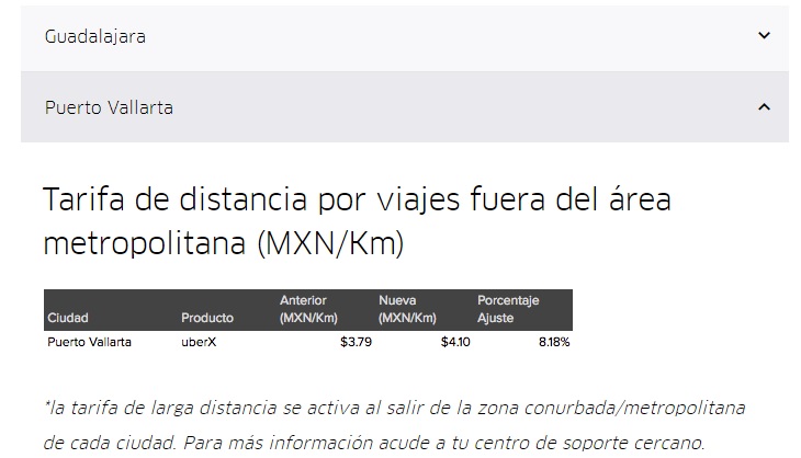 Queremos comunicarte que, a partir de este lunes 25 de junio de 2018, la tarifa por viajes de larga distancia se actualizará en las siguientes ciudades: Guadalajara, Puerto Vallarta, Nuevo Vallarta, Tepic, Aguascalientes, Morelia, Uruapan, León, Guanajuato, San Miguel de Allende, Irapuato, Celaya y Salamanca”.