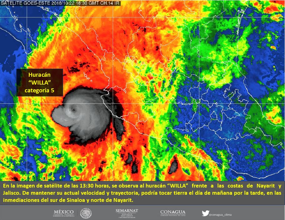 El huracán Willa, de categoría 5 en la escala Saffir-Simpson, originará oleaje elevado de 6 metros (m) con posible formación de trombas marinas frente a las costas de Puerto Vallarta, informó el Servicio Meteorológico Nacional (SMN).