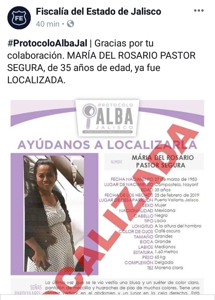 La Fiscalía General de Jalisco informó que la joven embarazada María del Rosario Pastor Segura que desapareció hace poco más de un mes en Puerto Vallarta fue localizada.