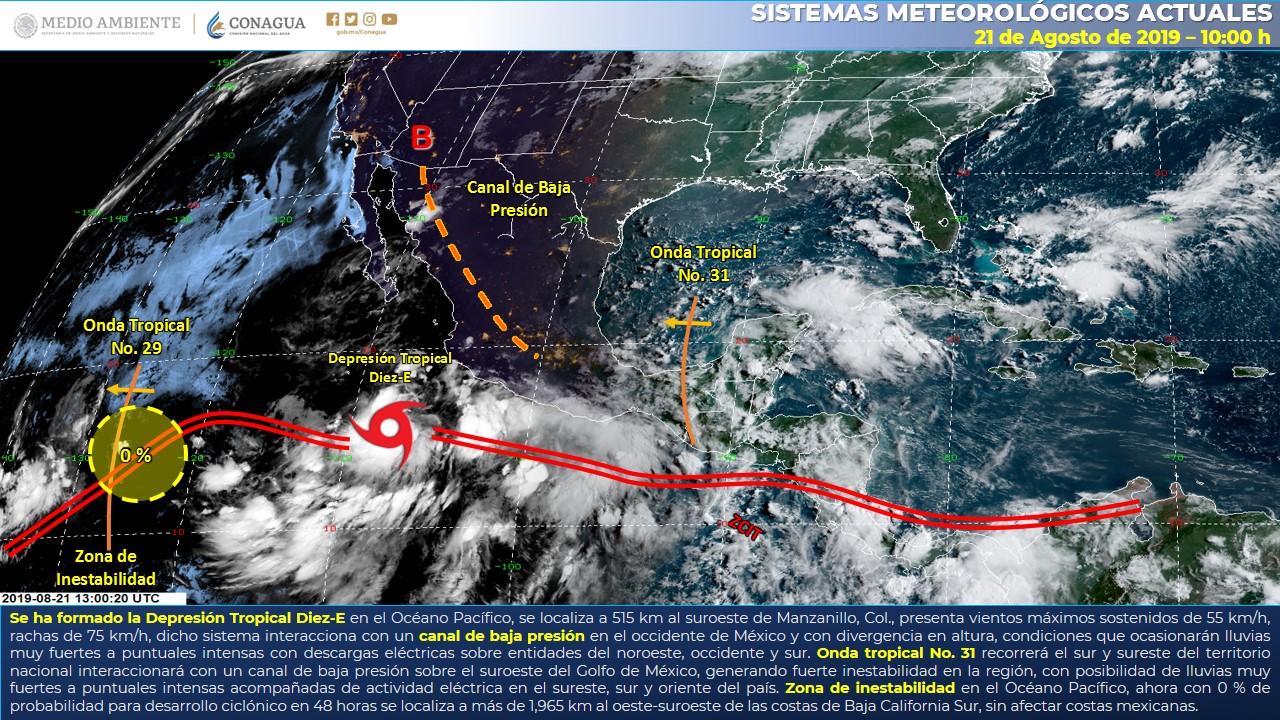 Se ha formado la Depresión Tropical “DIEZ-E” en el Océano Pacífico, se localiza a 515 km al suroeste de Manzanillo, Col., y a 875 km al sur-sureste de Cabo San Lucas B.C.S., interacciona con un canal de baja presión en el occidente de México y con divergencia en altura, condiciones que ocasionarán amplia zona de nublados con potencial de lluvias muy fuertes a puntuales intensas acompañadas de descargas eléctricas sobre entidades del noroeste, occidente y sur del territorio nacional, con posibilidad de deslaves, aumento en los caudales de ríos y arroyos e inundaciones en zonas bajas de dichas regiones, además de rachas fuertes de viento y oleaje elevado en costas de Jalisco, Colima y Michoacán.