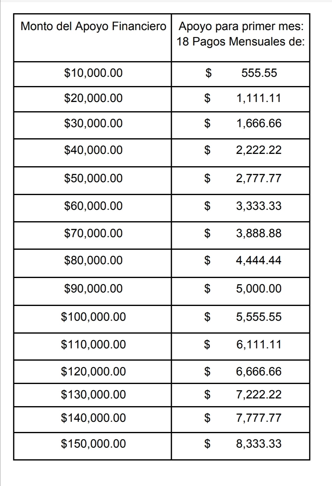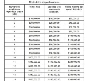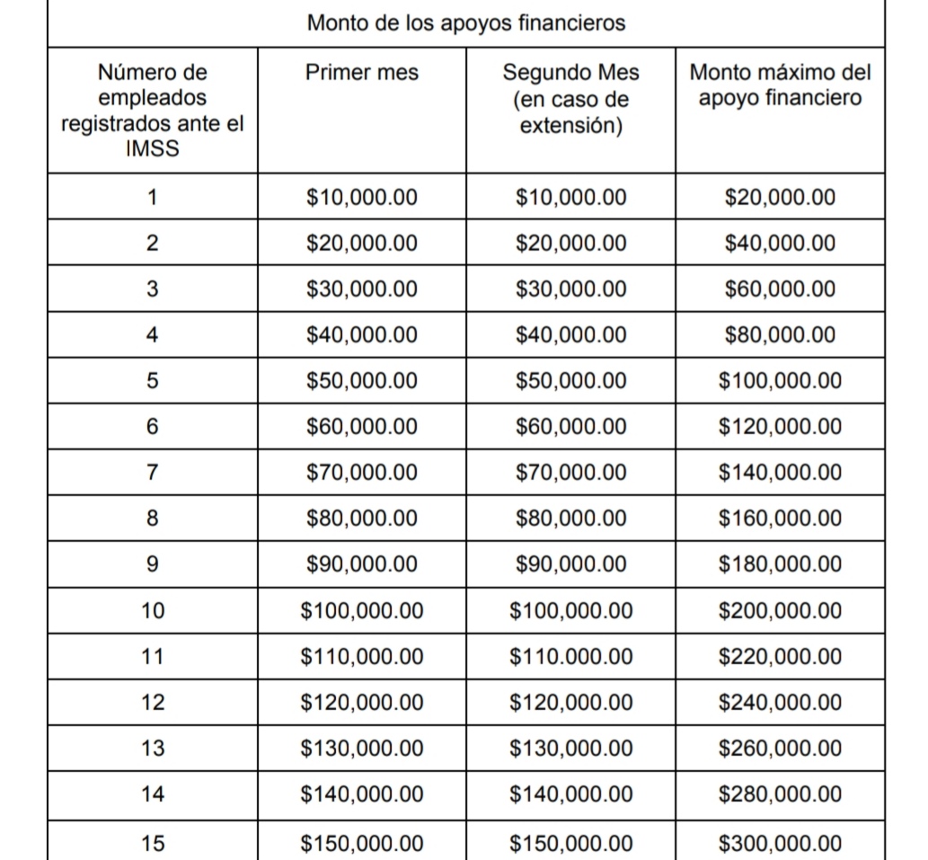 El Apoyo Financiero para capital de trabajo para el primer mes será de 10 mil pesos por trabajador registrado ante el IMSS y hasta 150 mil pesos por empresa, por mes. En caso de que se otorgue una