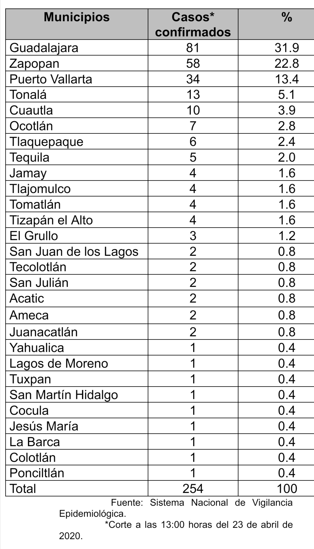 El municipio de Guadalajara encabeza la lista de casos confirmados con 81 (31.9 por ciento); seguido de Zapopan con 58 casos (22.8 por ciento); mientras que Puerto Vallarta ocupa el tercer lugar estatal con 34 contagios confirmados en total (13.4 por ciento). En seguida está Tonalá en cuarto sitio con trece casos; Cuautla con diez casos; Ocotlán con siete casos y Tlaquepaque con seis; y los 21 municipios restantes con menos de cinco casos (ver tabla anexa).