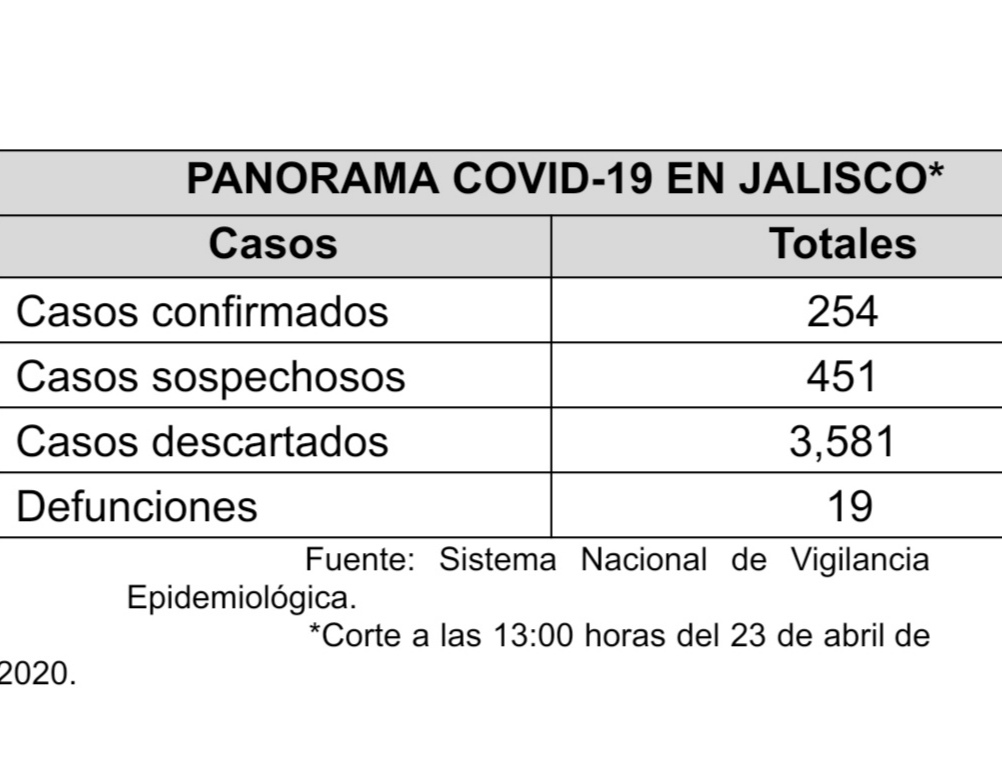 El Estado de Jalisco notificó hoy 19 casos nuevos de COVID-19 y cuatro defunciones más por esta enfermedad. Con estas cifras se acumulan 254 casos confirmados en la entidad jalisciense registrados en la plataforma del Sistema Nacional de Vigilancia Epidemiológica.