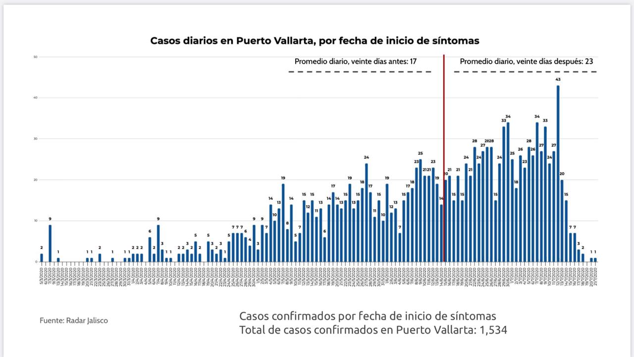 En un video publicado hace unos minutos en sus redes sociales este miércoles, el Gobernador Enrique Alfaro Ramírez, junto al alcalde Arturo Dávalos Peña, informó que la ocupación hospitalaria del Hospital Regional de Puerto Vallarta se encuentra en un 50 por ciento, en donde también compara 2 gráficas más del antes y después de abrir las playas, pues sí ha existido un incremento de casos de Covid-19.