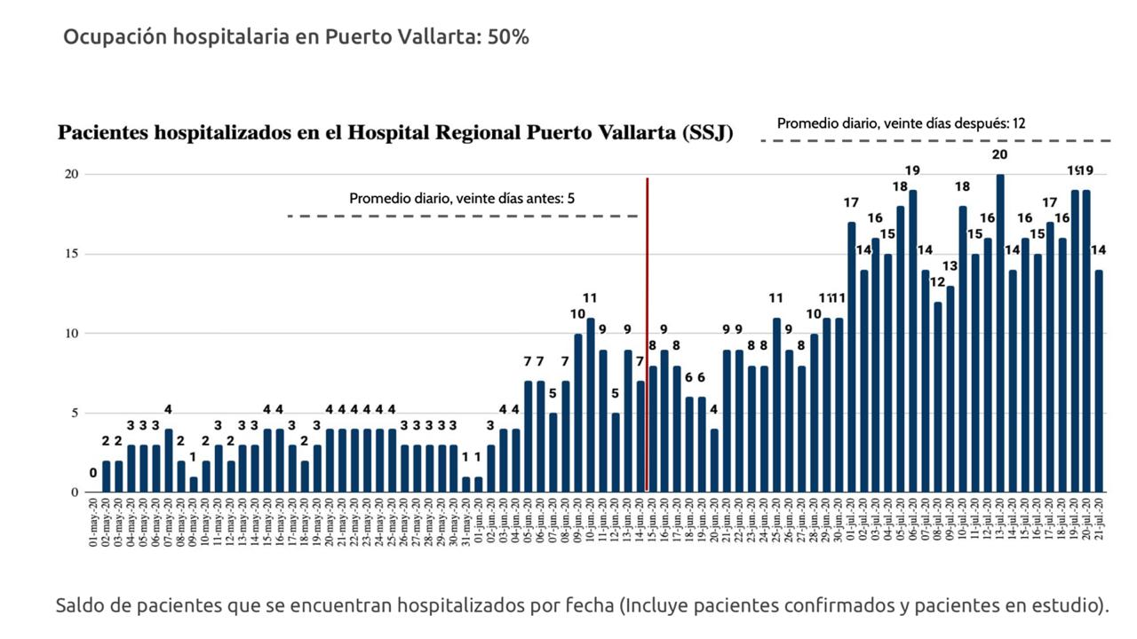 Sobre la ocupación hospitalaria, el Gobernsdor mostró gráficas del Hospital Regional de Puerto Vallarta, en el que diariamente había 5 personas hospitalizadas, pero ahora son 12, dándose un aumento sustancial desde el 01 de julio.