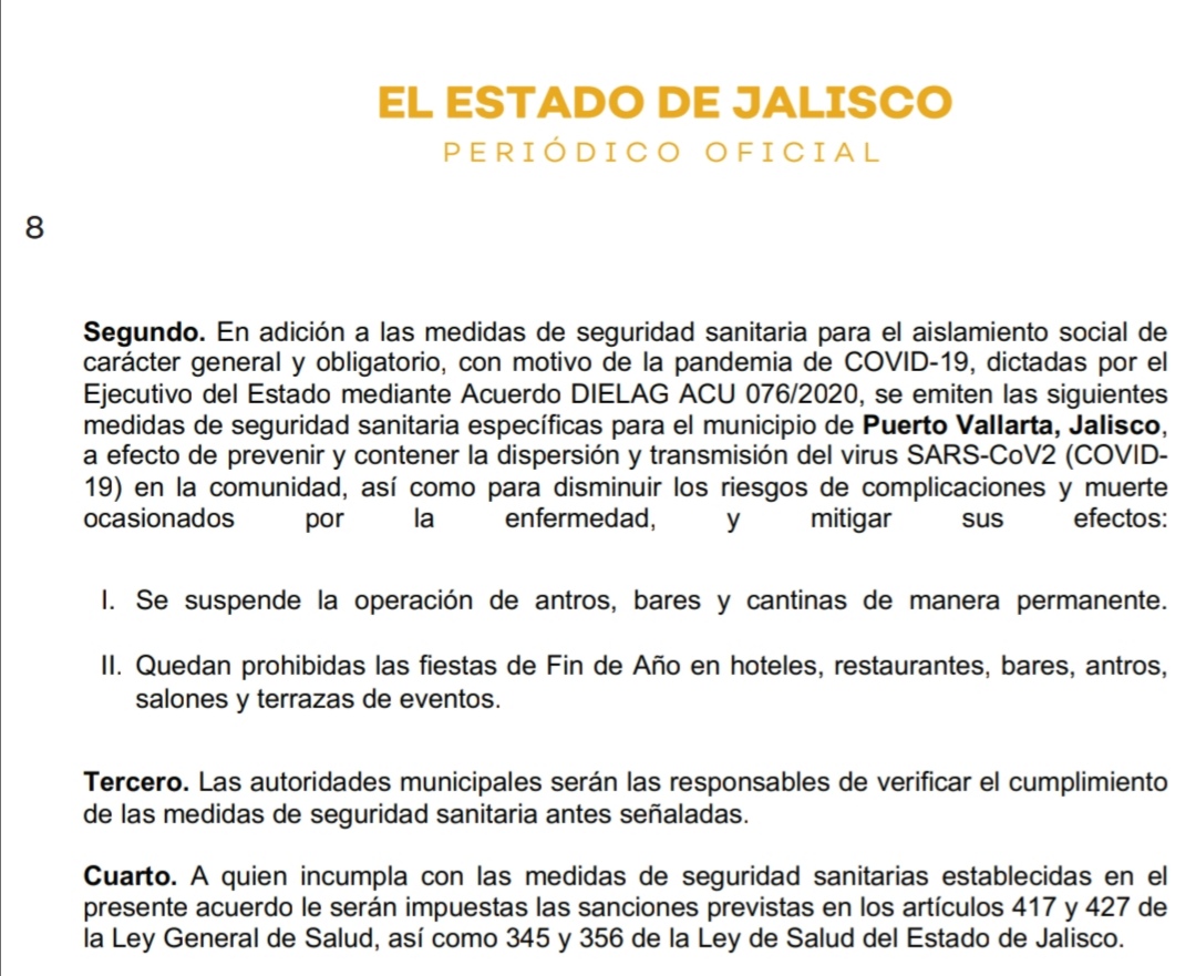 Bares, antros y cantinas de Puerto Vallarta no podrán abrir en ningún horario del 25 de diciembre al 10 de enero, de acuerdo al decreto de cierre de actividades publicado en el Periódico Oficial de Jalisco.
