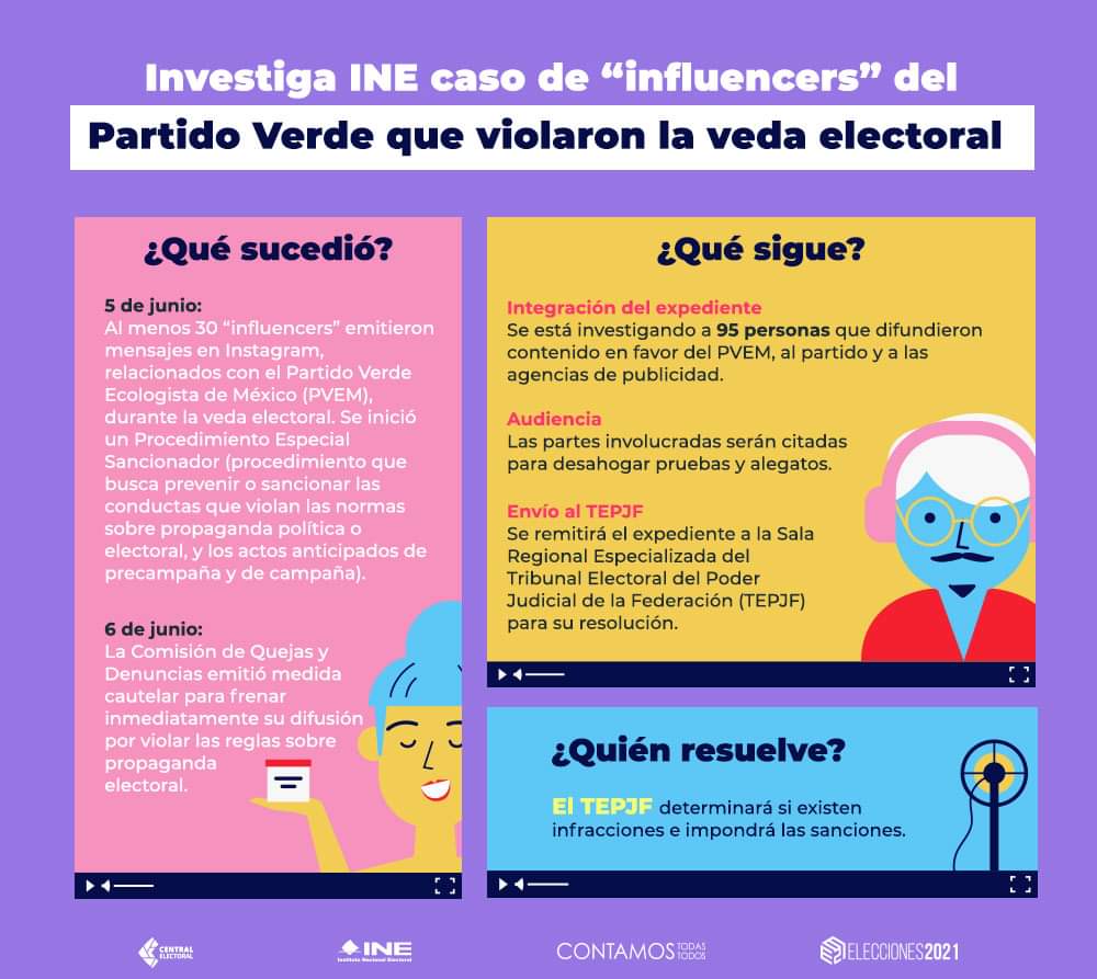 El 05 de junio se detectó a aproximadamente 30 artistas e influencers que emitieron mensajes en la red social instagram para apoyar al PVEM durante la veda electoral. Por ello el INE inició un procedimiento especial sancionador.
