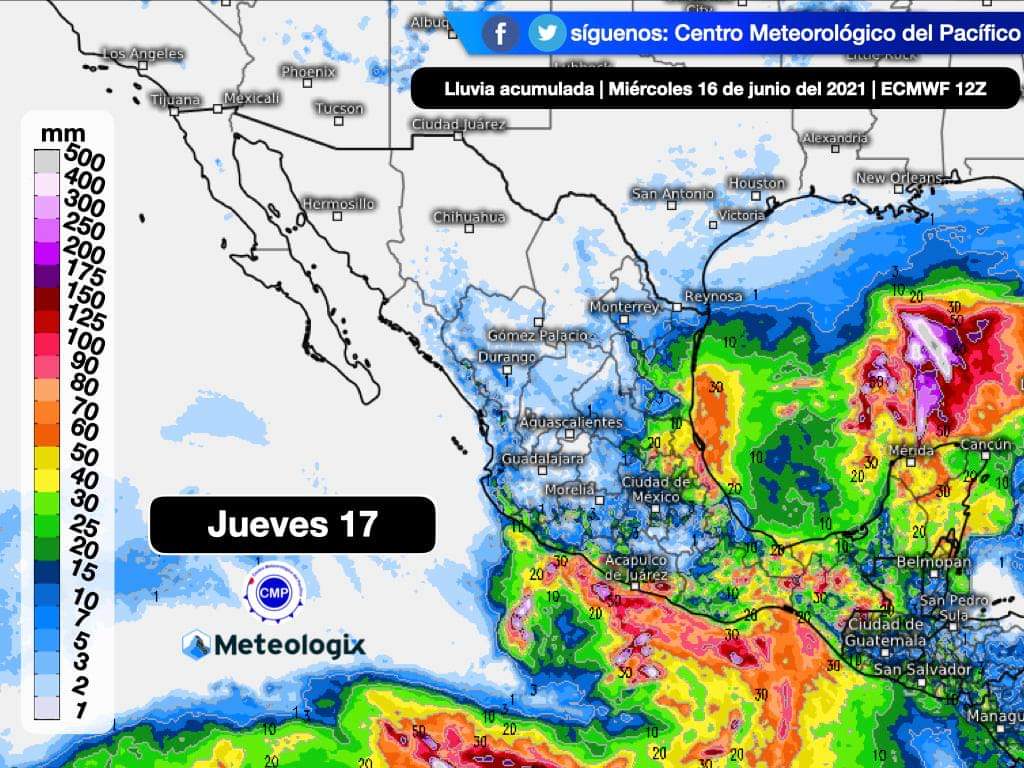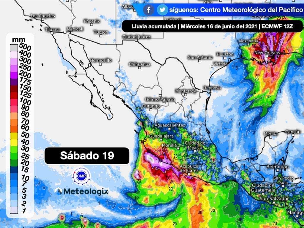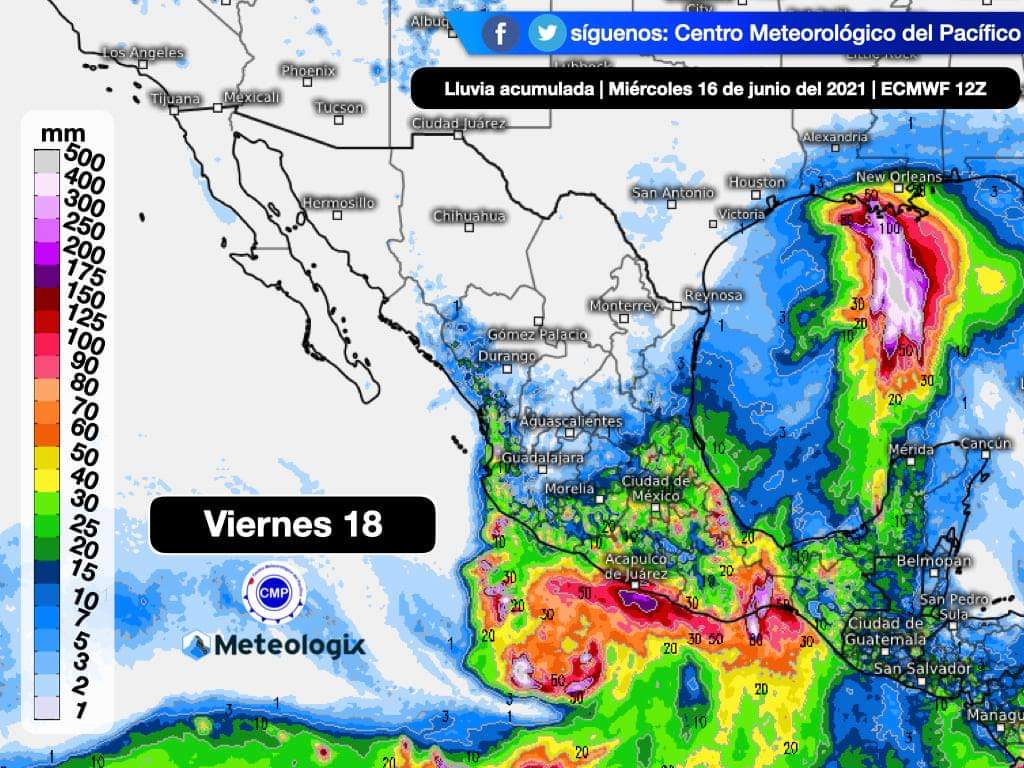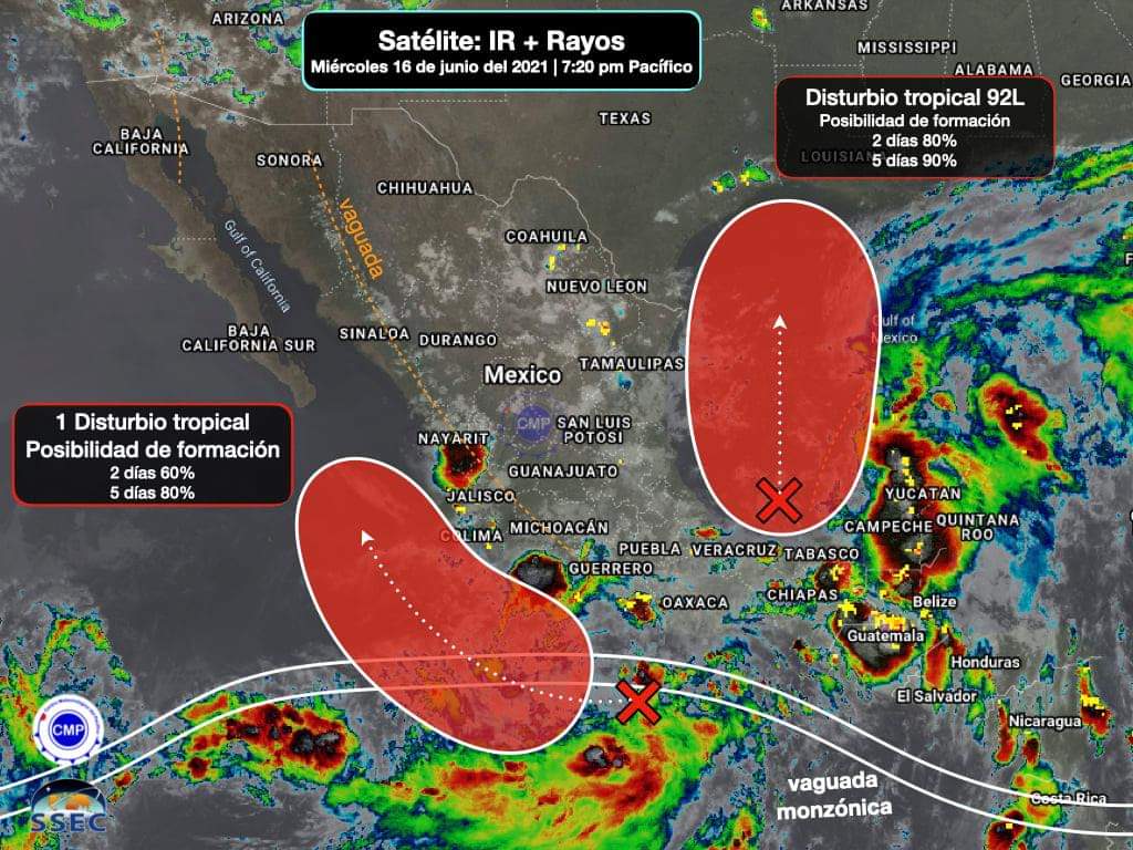 El Centro Meteorológico del Pacífico informó a partir del viernes se prevé aumento de lluvias y tormentas fuertes y locales fuertes a torrenciales en occidente, sur, centro, oriente y sureste del país, debido a la cercanía dos disturbios tropicales; uno cercano frente a las costas de Oaxaca y otro cercano frente a costa sur de Veracruz, así como la interacción de la vaguada monzónica, el paso de un onda tropical y vaguadas sobre el occidente y sureste del país.