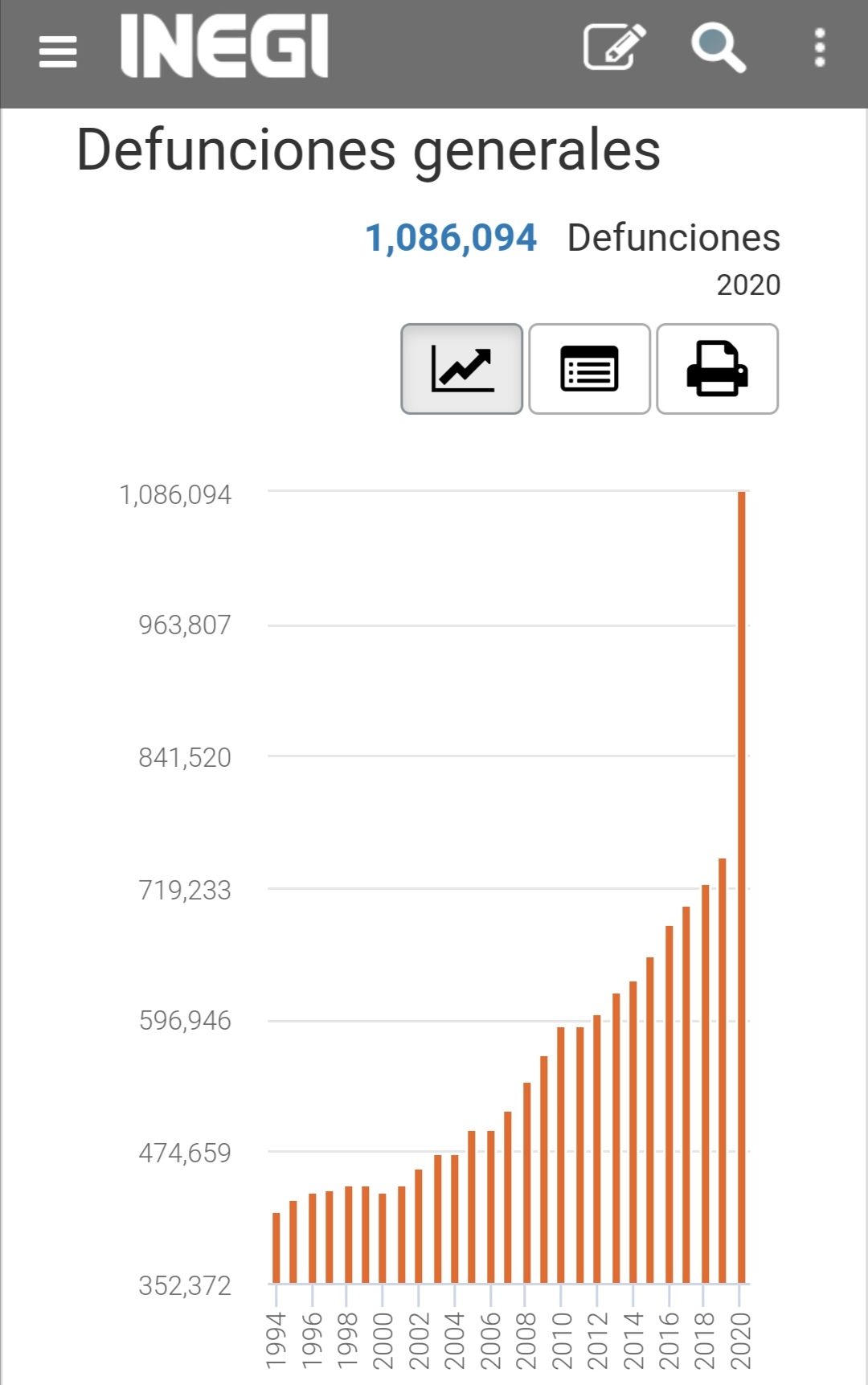 Durante 2020 en México se contabilizaron un total de 1 086 094 muertes de acuerdo a INEGI. Es decir, 86 muertos por cada 10 mil habitantes.