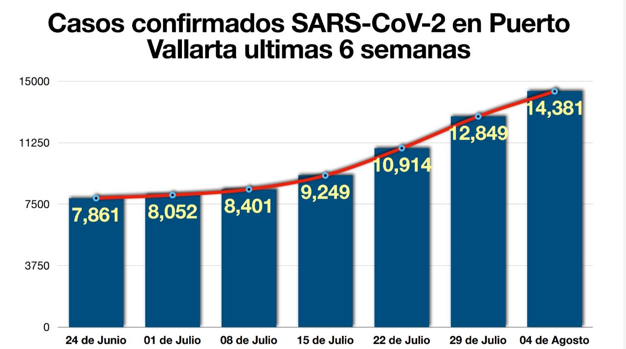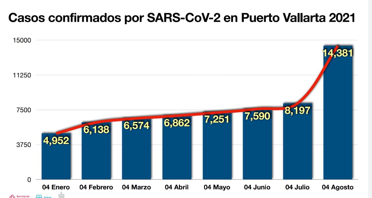 Del 4 de julio al 04 de agosto se registraron 6 mil nuevos contagios en Puerto Vallarta, lo que ha levantado las alertas en la ciudad, pues ni siquiera en los picos de enero y febrero, cuando no se había aplicado la vacuna, hubo estos números.