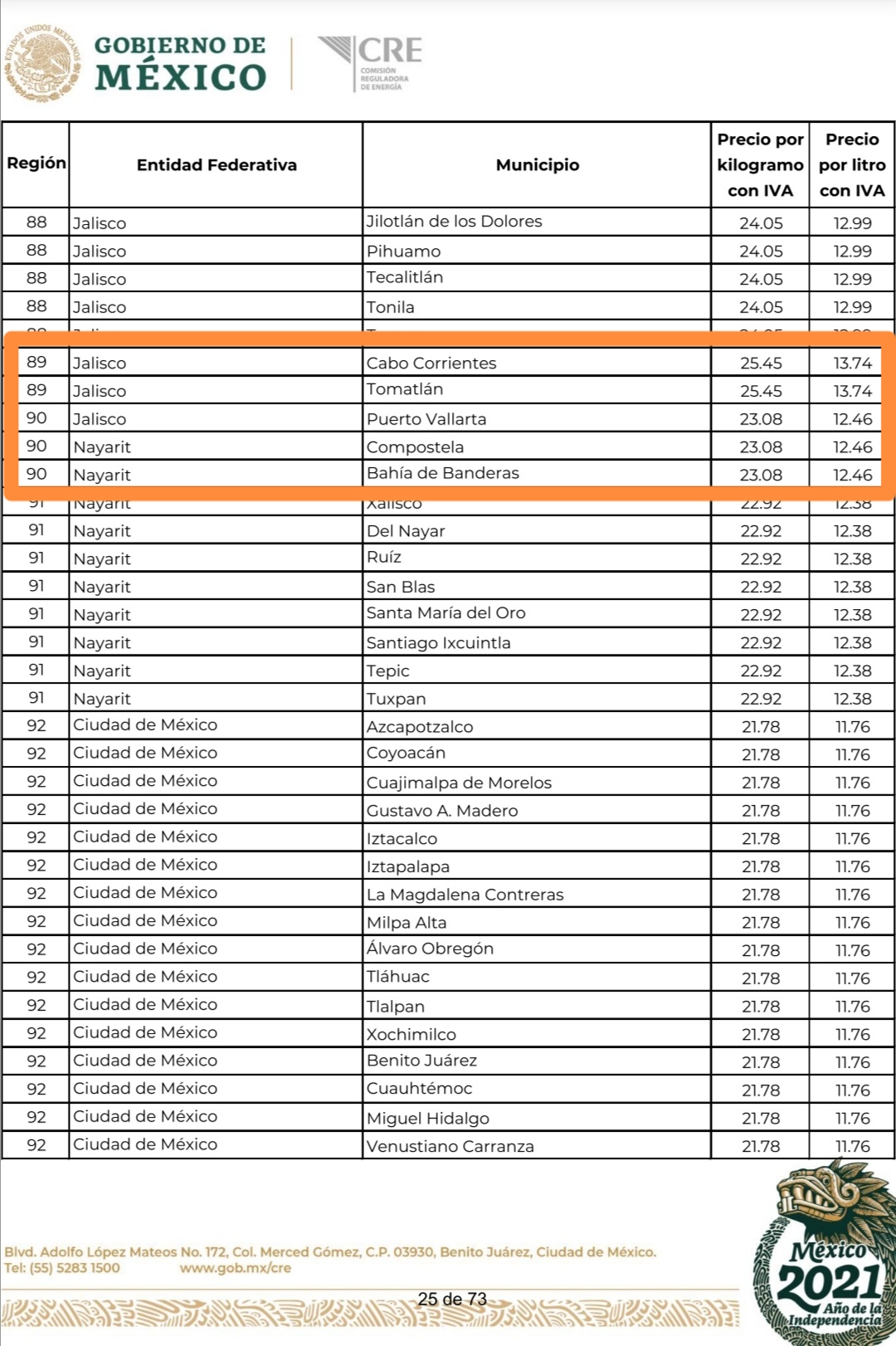 Para Puerto Vallarta, Bahía de Banderas y Compostela el precio por kilo se fijó en 23.08 pesos por kilogramo con IVA y 12.46 pesos por litro con IVA. Un tanque de gas de 30 kilos saldría en 692.50 pesos.