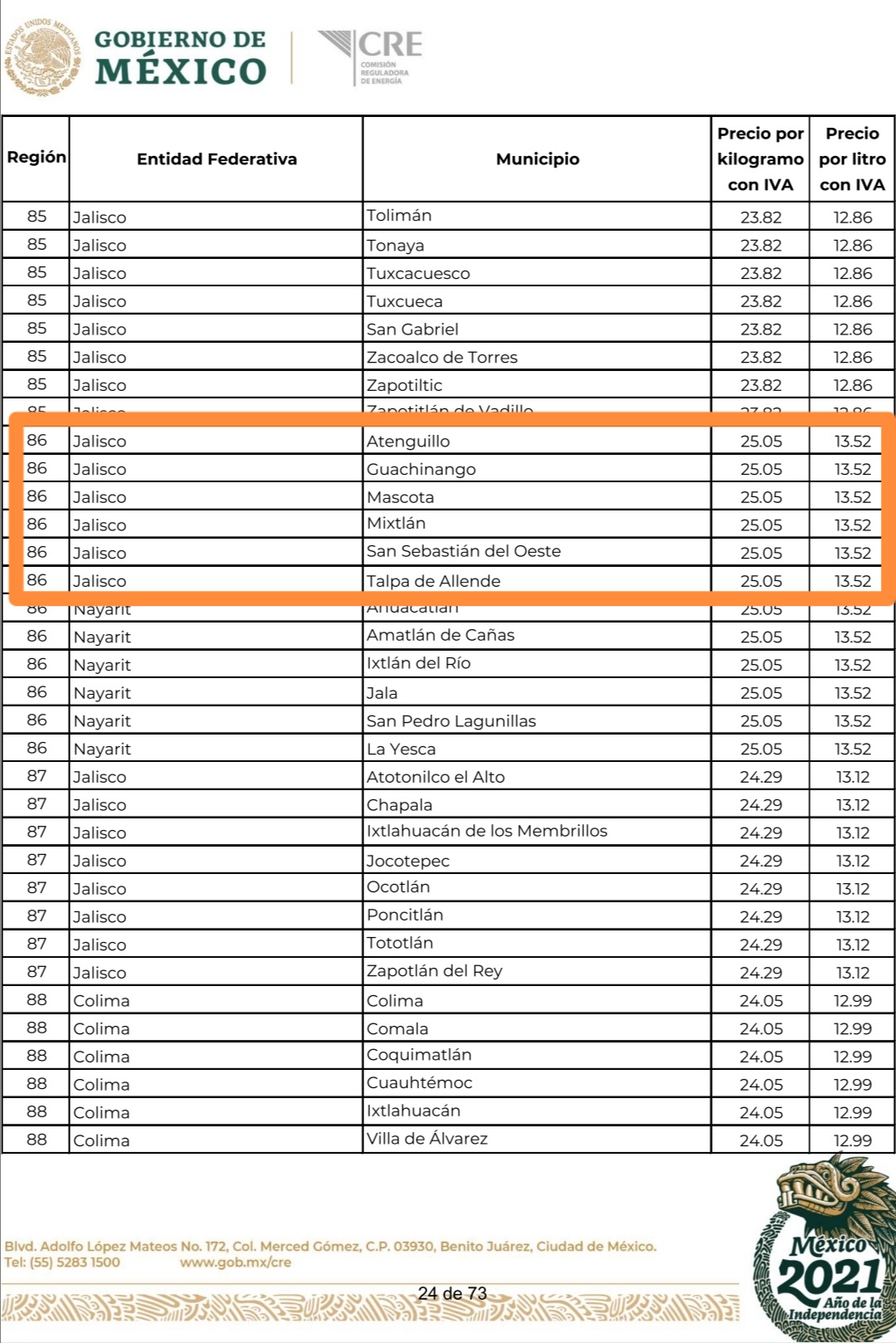 En Atenguillo, Guachinango, Mascota, Mixtlán, San Sebastián del Oeste y Talpa de Allende el tanque de gas costaría 751.50 pesos, pues el kilo se fijó en 25.05 pesos y el litro en 13.52 pesos.