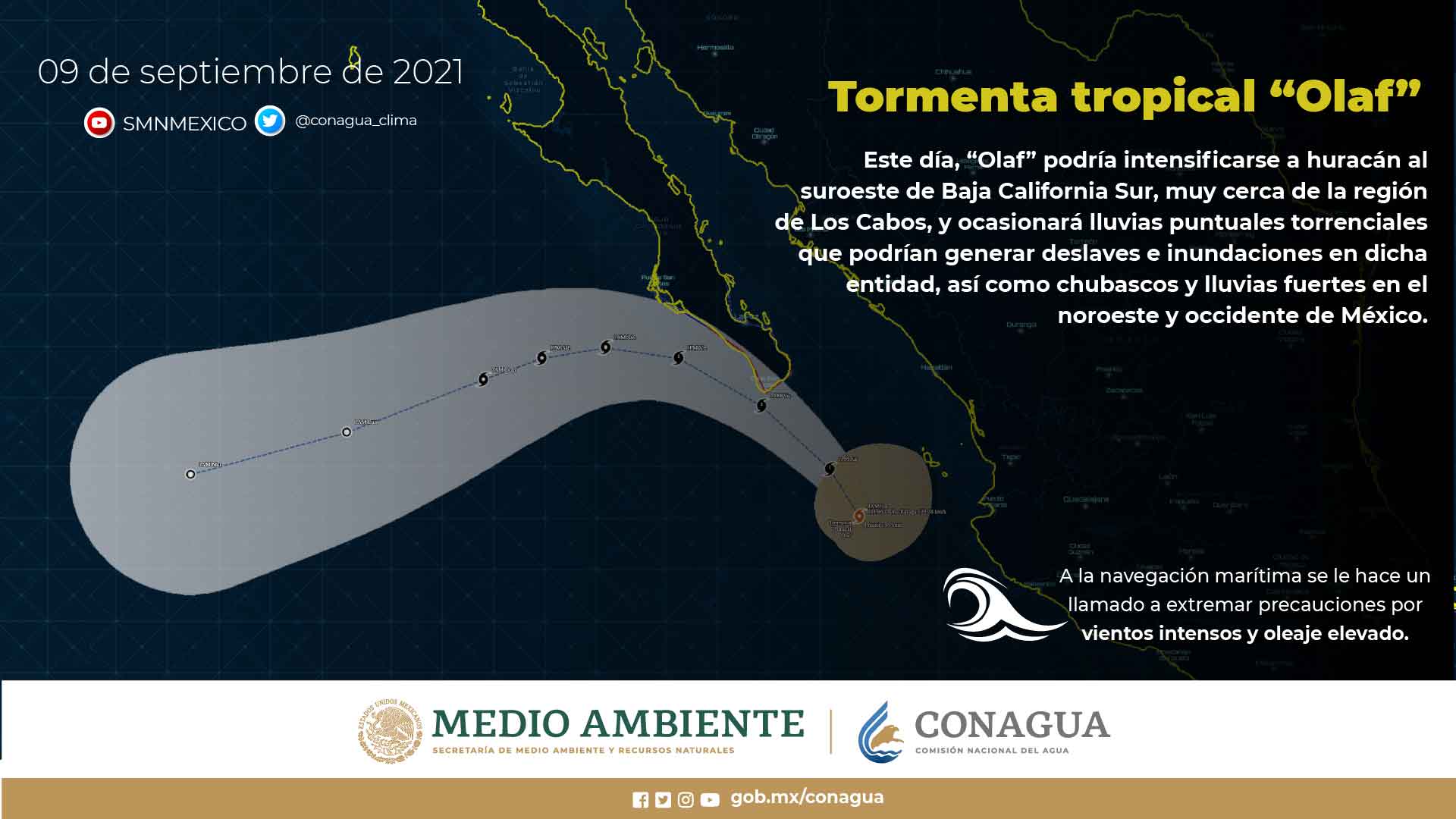 Este jueves, la tormenta tropical Olaf originará lluvias torrenciales (de 150 a 250milímetros [mm]) en Baja California Sur; fuertes (de 25 a 50 mm) en Jalisco, Nayarit y Sinaloa, y chubascos (de 5 a 25 mm) en Baja California, Colima y Sonora, además de viento con rachas de 80 a 100 kilómetros por hora (km/h) y oleaje de 5 a 7 metros (m) de altura en la costa de Baja California Sur; rachas de 60 a 80 km/h y olas de 2 a 3 m en el sur del Golfo de California, y rachas de 50 a 60 km/h en el noroeste de Sonora, con oleaje de 2 m de altura en Sinaloa.