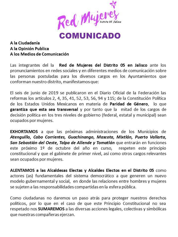 Las integrantes de la  Red de Mujeres del Distrito 05 en Jalisco ante los pronunciamientos en redes sociales y en diferentes medios de comunicación sobre las personas postuladas para los diversos cargos en los Ayuntamientos que conforman nuestro distrito, manifestamos que: