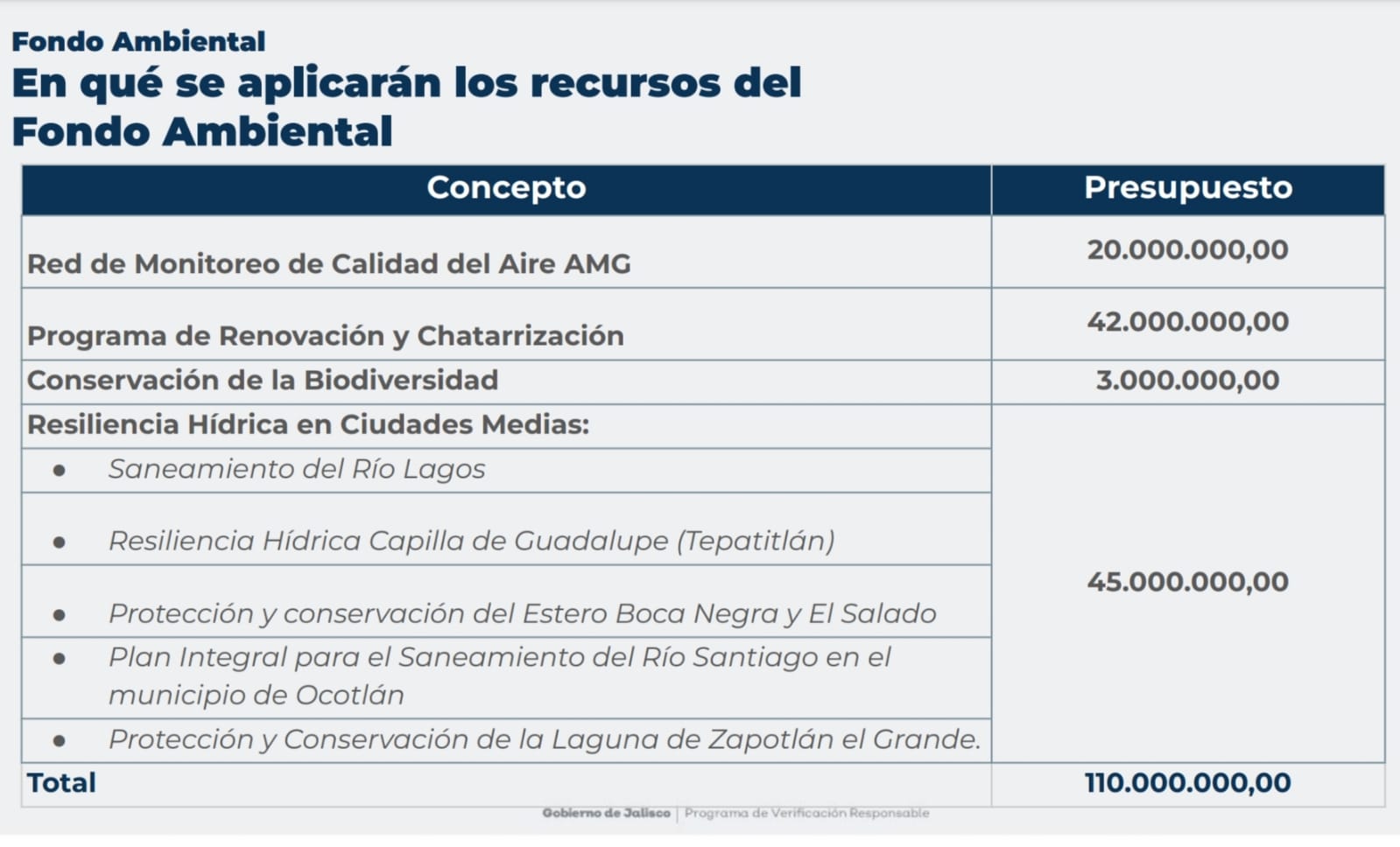 De la aplicación de los recursos del FondoAmbiental por 110 millones de pesos: 20 millones serán para la red de monitoreo de calidad del aire del Área Metropolitana de Guadalajara, 42 millones para un programa de renovación (de vehículos) y chatarrización, 3 millones para conservación de la biodiversidad y 45 millones para el saneamiento del río Lagos, resilencia hídrica capilla de Guadalupe en Tepatitlán, el plan de saneamiento del río Santiago en Ocotlán, protección y conservación de la laguna de Zapotlán El Grande y de los esteros Boca Negra y El Salado en Puerto Vallarta.