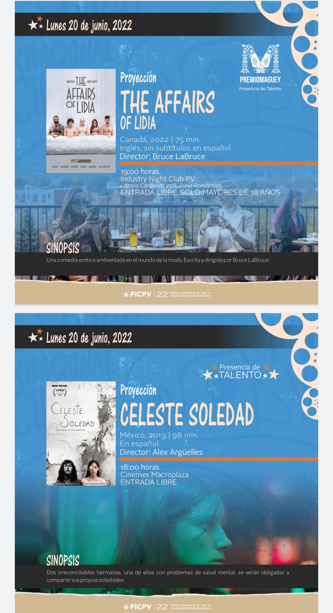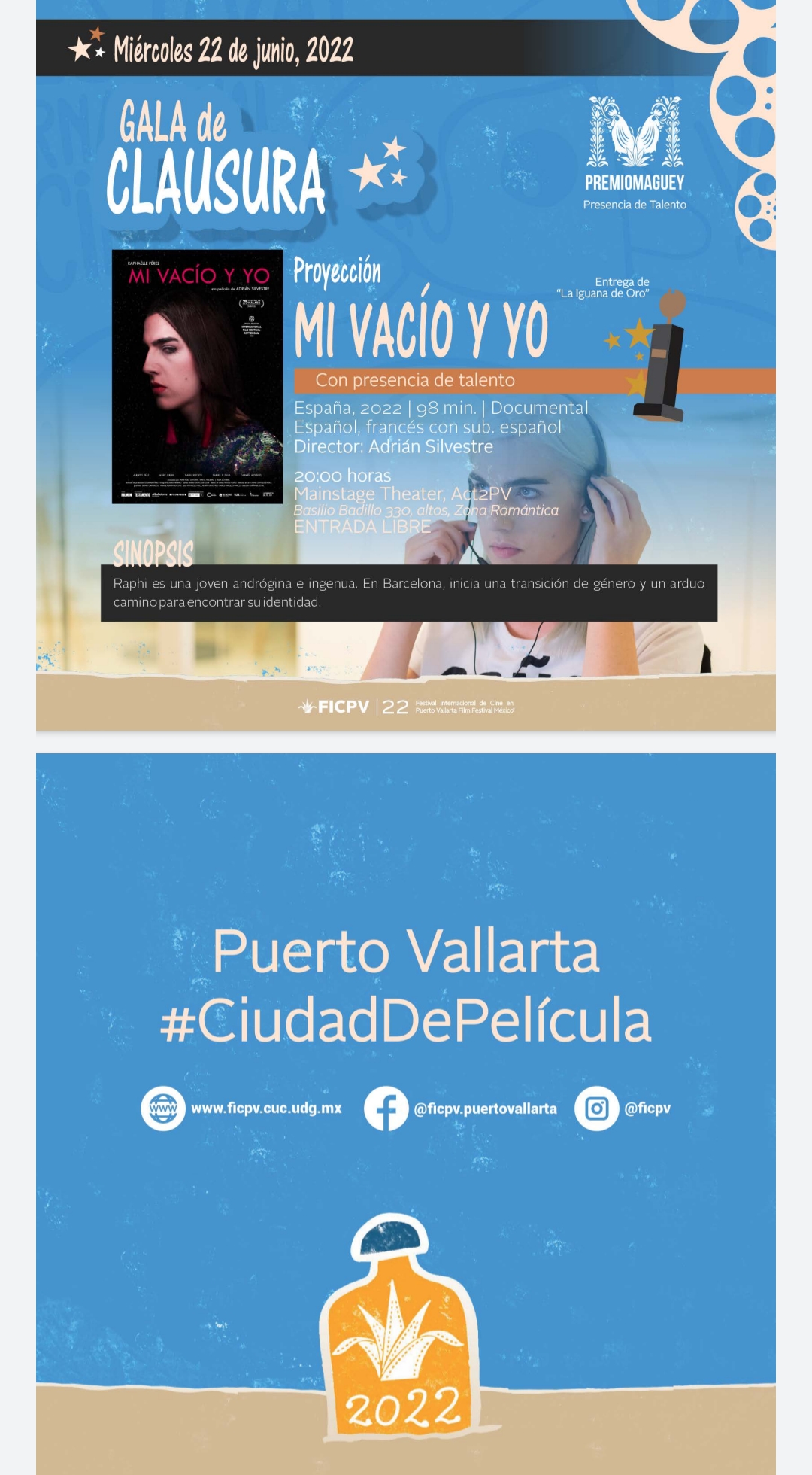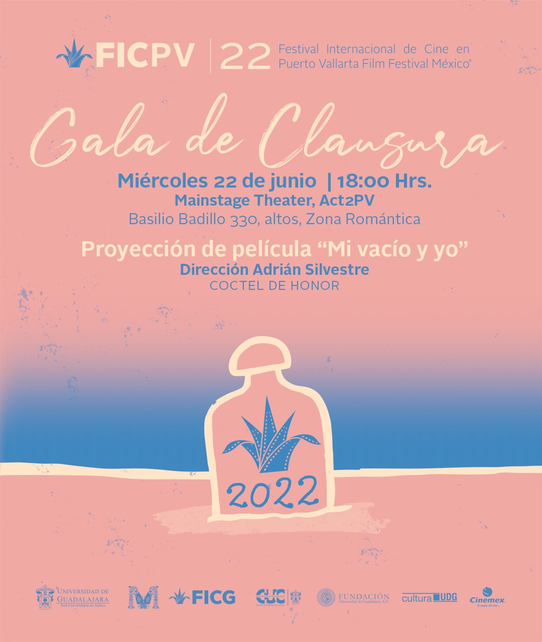 La ceremonia de clausura se llevará a cabo el miércoles 22 de junio a las 19:00 horas en el teatro y centro de espectáculos Act2PV, ubicado en la Zona Romántica, con la proyección del filme “Mi vacío y yo” (España, 2022), con presencia del director Adrián Silvestre y la actriz Raphaelle Pérez.