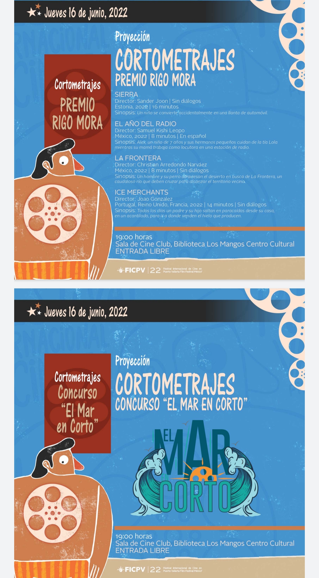 El FICPV en su edición 22 está integrado por la sección Oficial, sección Académica y Premio Maguey. Mención especial merece el programa de cortometrajes “Premio Rigo Mora” con trabajos de México, Islandia y Francia, alternando con los cortometrajes de producción vallartense que fueron inscritos en el segundo concurso “El mar en corto”.