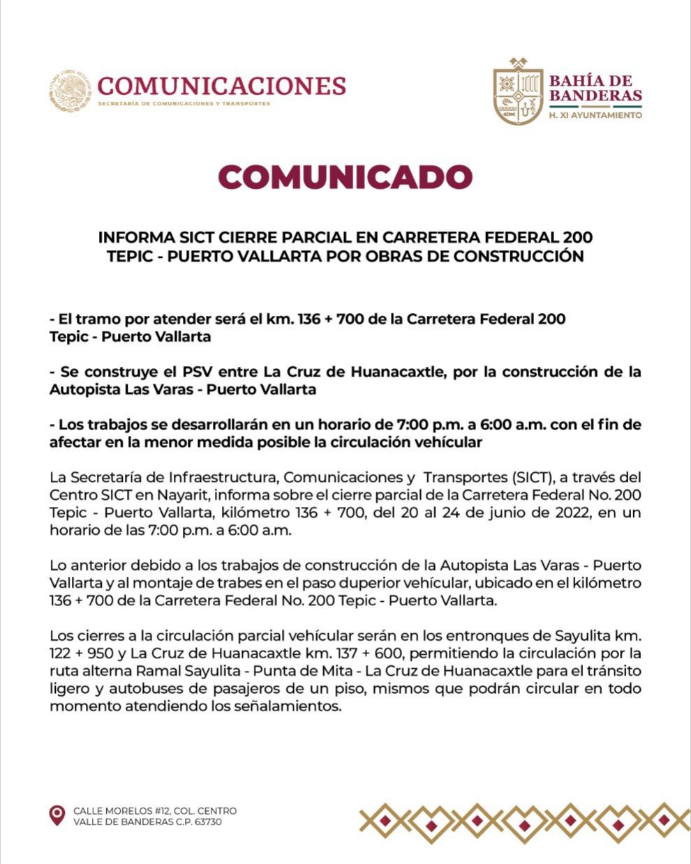 La presidenta municipal de Bahía de Banderas informó que debido a la construcción de la Autopista Las Varas-Puerto Vallarta, del 20 al 24 de junio la carretera federal 200 tendrá un el cierre parcial en ambos sentidos en el kilómetro 136-700, en un horario de 7 de la noche a las 6 de la mañana (hora centro).