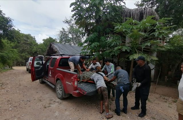 Los oficiales en coordinación con personal de Ecología lograron la captura del ejemplar, que se había salido del reptilario y andaba entre las ramadas, para posteriormente revisarlo y le colocaron la marca de registró bajo el número 963 para posterior proceder con su liberación en su habitad natural.