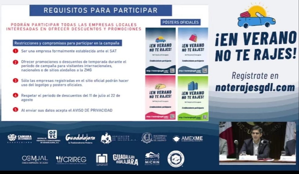 Precisa que esta segunda edición de “En Verano No te Rajes”, funcionará como el del “Buen Fin”, es decir, se respetarán precios solo durante el periodo antes señalado. Las empresas que deseen participar, deben inscribirse en: http://noterajesgdl.com/registro/ a fin de recibir vía e mail, mensaje de confirmación y link para descargar logotipo y manual de uso de marca.