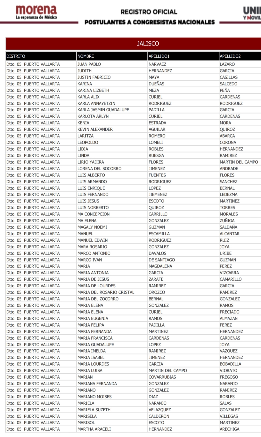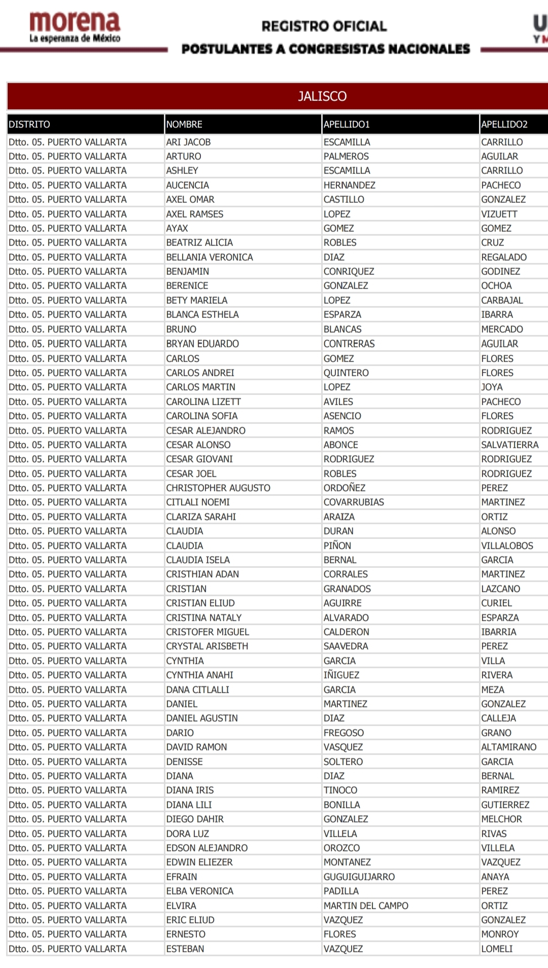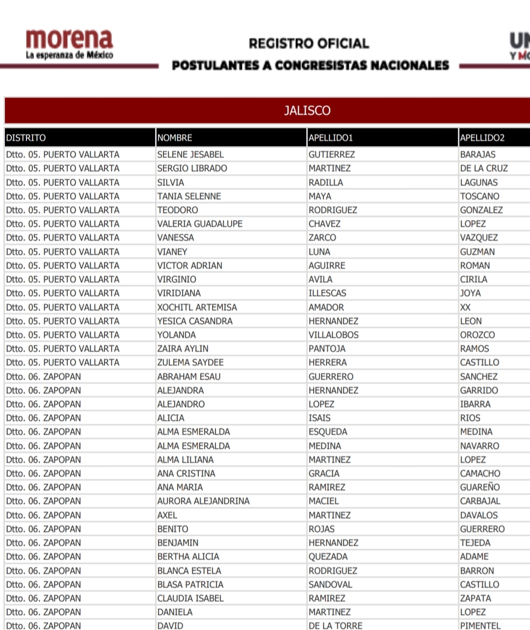El Partido Movimiento Regeneración Nacional (Morena) publicó la lista de los aspirantes a congresistas nacionales, que a su vez fungirán cómo consejeros distritales de ser electos. En el caso del quinto distrito se registraron 276 personas.