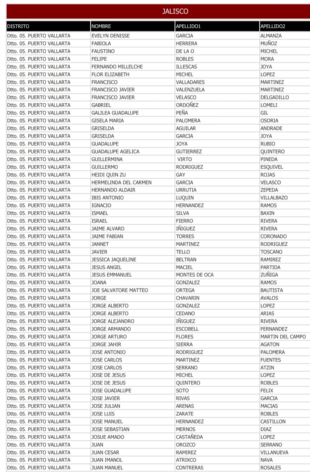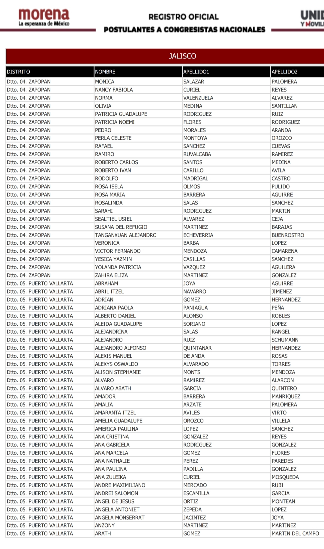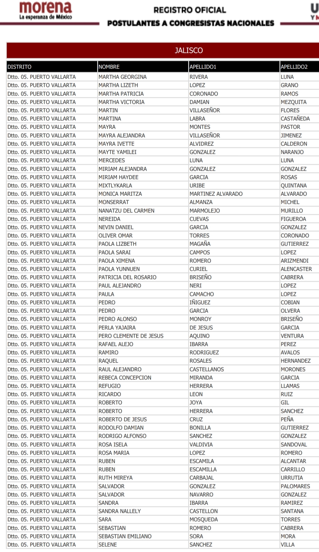 El Partido Movimiento Regeneración Nacional (Morena) publicó la lista de los aspirantes a congresistas nacionales, que a su vez fungirán cómo consejeros distritales de ser electos. En el caso del quinto distrito se registraron 276 personas.