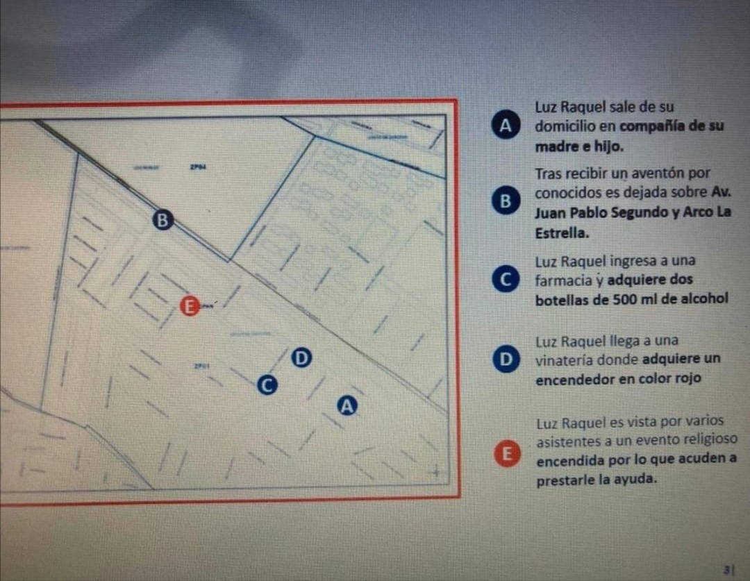 “…El día de los hechos, el día 16 de julio, se localizaron en el radio de acción donde se localizó   a luz y donde se le dieron primeras  atenciones, las dos botellas de alcohol y el encendedor, así como la cubeta y la mochila  con algunas de las pertenencias que estaban en su interior. Estas dos botellas de alcohol, se fijaron pericialmente como se deben realizar, en todos los levantamientos de indicios, y la investigación que llevamos hasta el momento, ya la tenemos soportada en la carpeta de investigación con algunas entrevistas y algunos testimonios. Tenemos una entrevista que más adelante voy a detallar, por parte de una persona que nos reconoce y señala a Luz Raquel, como la misma persona a la que le vende las dos botellas con alcohol.  Nosotros en el levantamiento de los indicios, logramos determinar que una de las botellas de alcohol, que aparecen en la escena, es una de las que fue vendida  a Luz Raquel, una de las botellas de alcohol, trae como característica , una etiqueta en la tapa, más adelante viene una imagen, esa etiqueta , trae el nombre de la farmacia, razón por la cual empezamos a trabajar, a mapear toda la zona. Se ha estado trabajando en la zona, en búsqueda de in, de testimonios, de entrevistas, de cámaras, de rutas que nos permita llegar a cómo sucedieron los hechos…”