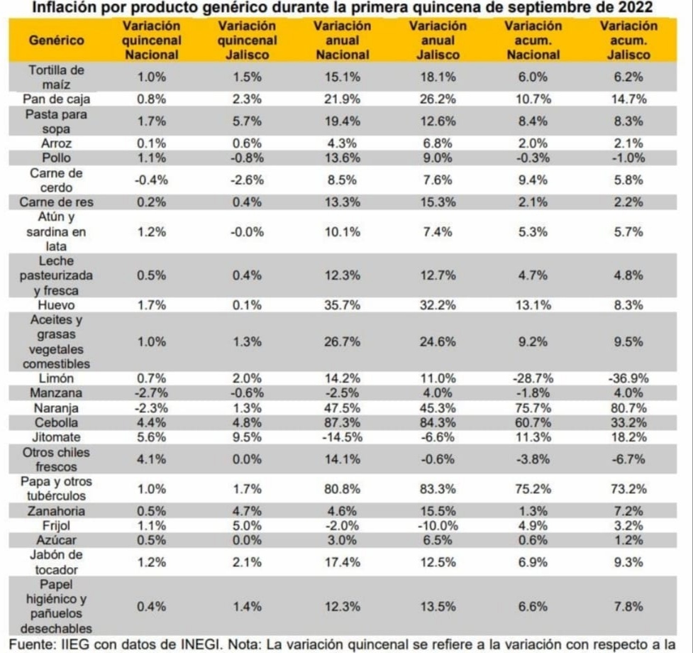 Aún y cuando desde mayo se instrumentó el PACIC, Paquete contra la Inflación y Carestía, impulsado por el gobierno federal, el costo de 17 de 23 productos de la Canasta Básica en Jalisco, han aumentado hasta primera quincena de septiembre, 8.9 por ciento , mientras que a nivel nacional este índice es de 9.7 por ciento, precisa estudio de la Dirección de Información Estadística, Económica y Financiera del IIEG.