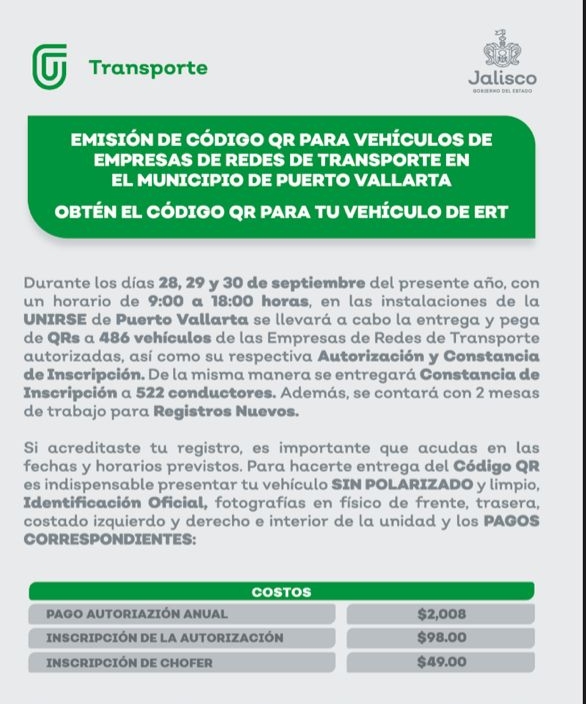 Del miércoles al viernes de esta semana la Secretaría de Transporte (Setran) entregará en Puerto Vallarta las calcomanías que contienen un código QR que, para su seguridad, los usuarios de plataformas o empresas de redes de transporte, podrán escanear para corroborar que se trata de un vehículo autorizado para prestar el servicio.
