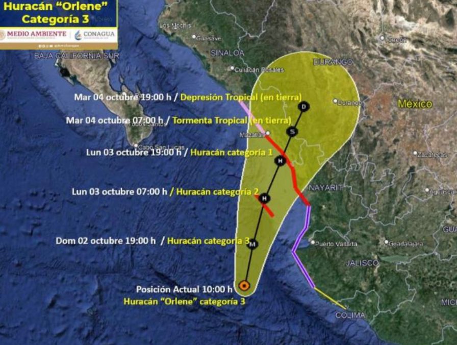 Luego de que la madrugada de este domingo 02 de octubre el Huracán Orlene, ascendió a categoría 4, en el litoral Occidente del país, avanza ya en nivel 3, próximo a Cabo Corrientes y Costa Sur, donde se registran oleajes altos y lluvias, confirma la Unidad Estatal de Protección Civil y Bomberos.
