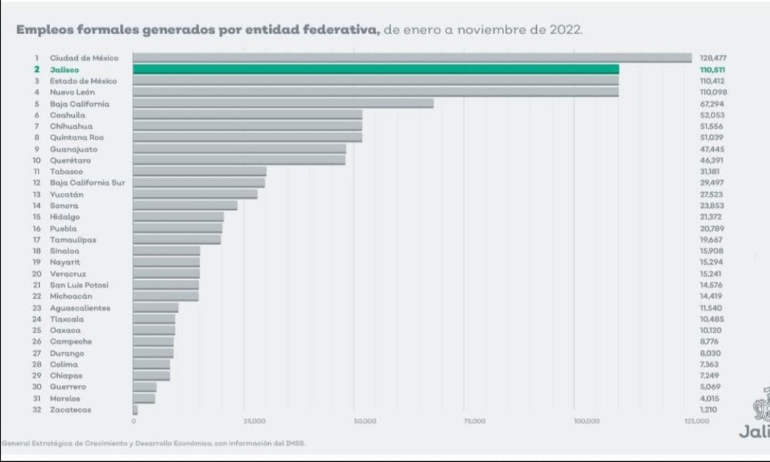 “…Durante este periodo a nivel nacional se han generado cerca de un millón, cien mil empleos formales, de los cuales Jalisco, aporta el diez por ciento, diez de cada cien empleos del país .De acuerdo con los últimos registros, del Instituto Mexicano del seguro Social, el IMSS, durante el mes de noviembre, las y los empresarios jaliscienses, lograron crear nueve mil 569 puestos de trabajo formal….”