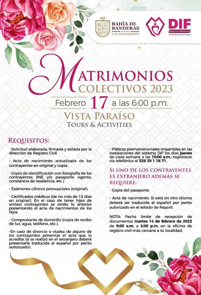 Entre los requisitos que en un momento se enumerarán, está el realizar las pláticas prematrimoniales, las cuales se estarán impartiendo los días jueves de cada semana a las 10:00 de la mañana en el Sistema DIF de Bahía de Banderas, ubicado en Valle de Banderas. A continuación, se enlistan los documentos requeridos para contraer matrimonio en las próximas bodas colectivas.