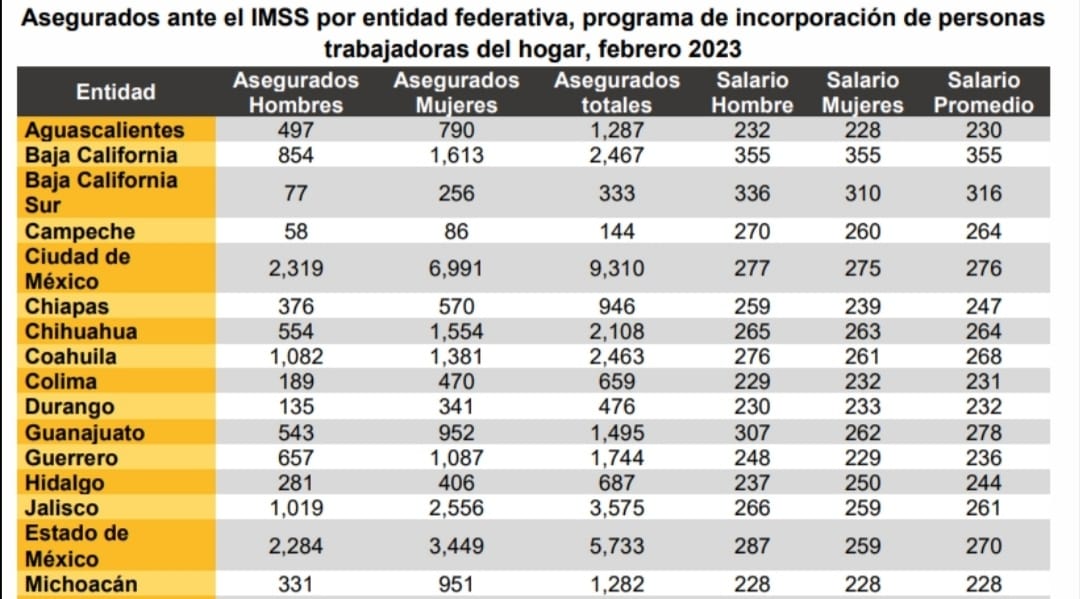 Precisa que a pesar de que el 27 de octubre de 2022, se avaló reforma a la Ley del Seguro Social, para incorporar al régimen obligatorio a este grupo laboral, que realiza actividades de limpieza, cuidado, asistencia o apoyo en un hogar ajeno al suyo, los cambios aún no permiten ver real incorporación de estas y estos empleados a citado esquema , que les dará garantías y certidumbre para su cesantía futura, ya que para este febrero pasado, se tenían inscritas, tres mil 575 personas, con un salario promedio diario de 261 pesos, mientras que a nivel nacional, 54 mil 623 , quedaron registradas, con una percepción de 264 pesos.