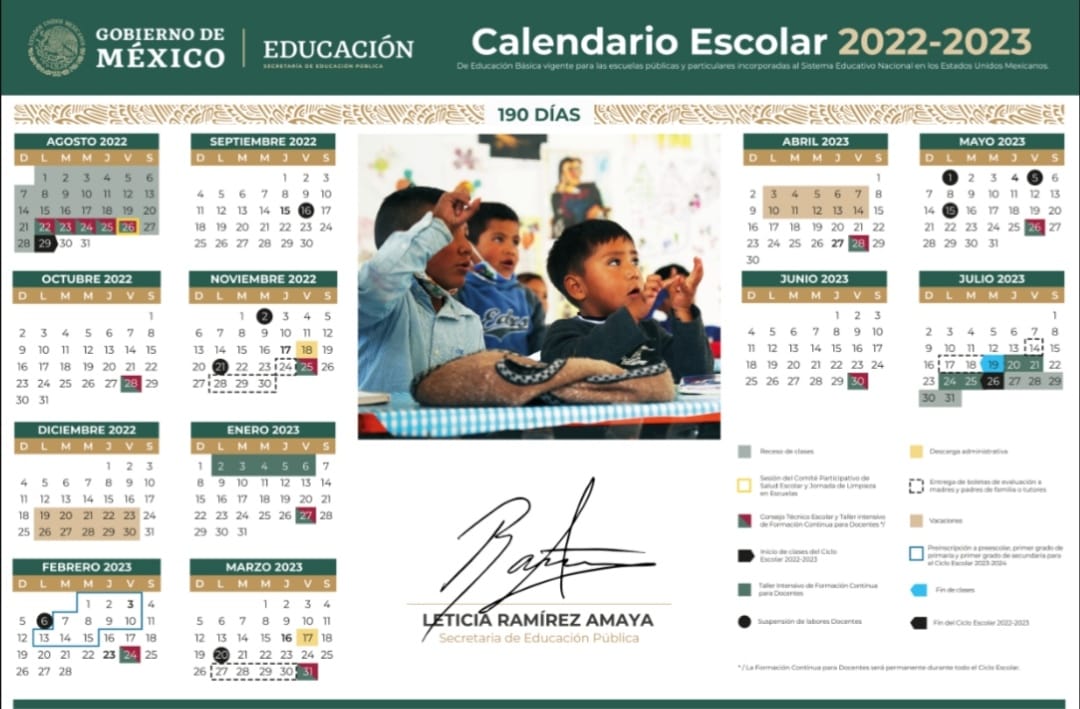 Precisa que previo al cierre oficial, del 14 al 18 de julio, se realizara la entrega de boletas de evaluación a madres y padres de familia o tutores. En tanto que el Taller Intensivo de Formación continua para maestras y maestros, programado inicialmente, del 5 al 9 de junio, pasará del 20 al 26 de julio; de igual forma, sostiene que queda eliminado el referido para alumnos, del 3 al 14 de julio, a fin de continuar con el trabajo escolar cotidiano, ya modificado. El arranque del ciclo escolar 2023-2024, está pactado para el lunes, 28 de agosto, considerando que se mantienen 190 días de clases efectivas del ciclo lectivo.