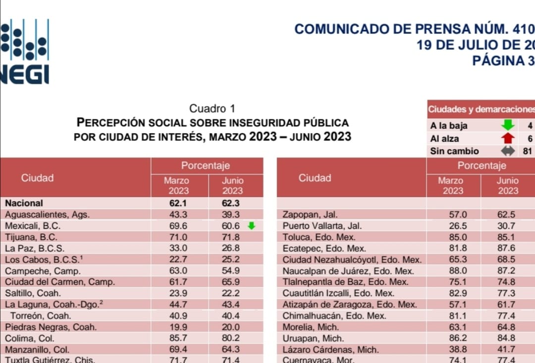 Aunque subió cuatro puntos de marzo a junio pasado, Puerto Vallarta, se mantiene entre las ocho ciudades del país, con menor percepción de inseguridad, al pasar de 26.5 a 30.7, esto es, tres de cada diez habitantes, mayores de 18 años consultados, consideró que vivir en este destino, es confiable o seguro, reporta la Encuesta Nacional de Seguridad Pública Urbana, del segundo trimestre 2023, afirma el INEGI, tras precisar que los niveles de protección ciudadana, otorgan garantías.