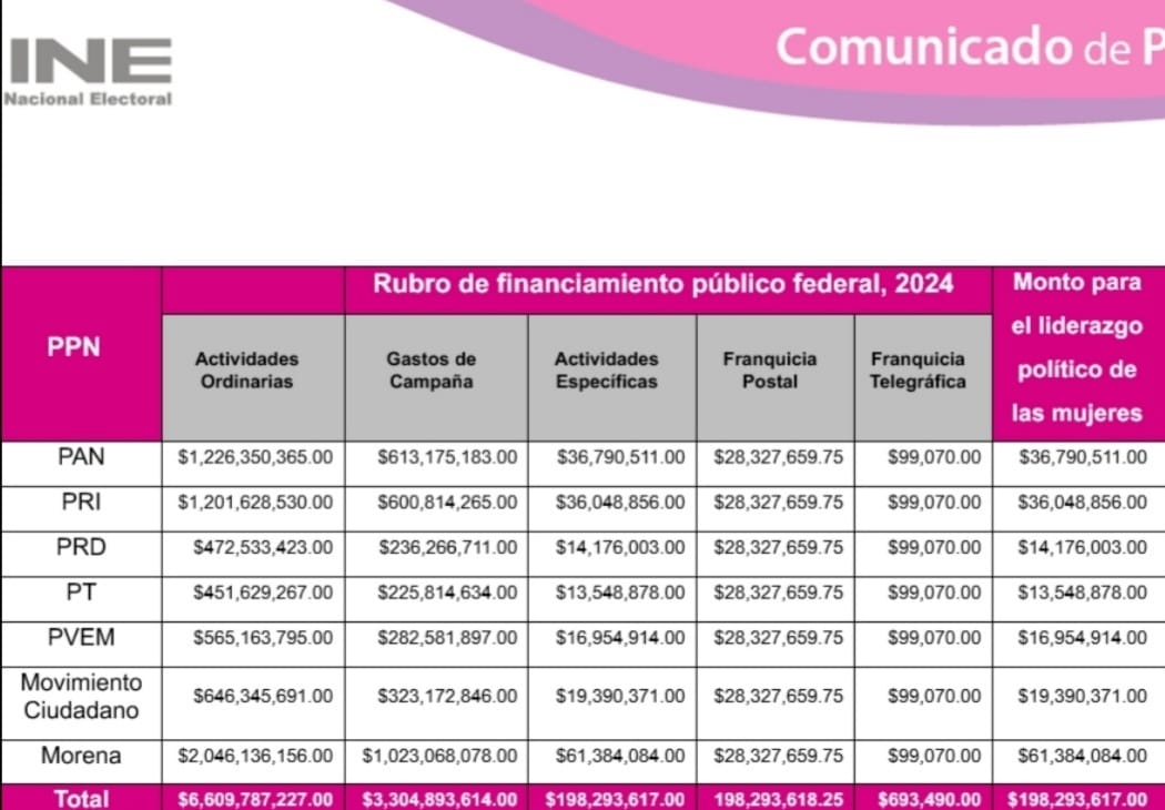 Aunque todavía falta que lo avale el Consejo General del INE, su Comisión de Prerrogativas, dio luz verde, según dispone el artículo 41 de la Constitución, al anteproyecto de acuerdo, que permita a los partidos políticos con registro nacional, como PRI, PAN, PRD, PVEM, PT, MC y MORENA, contar con diez mil 444 millones 157 mil 311 pesos, para gastos de campaña y operatividad general, durante 2024, año electoral.