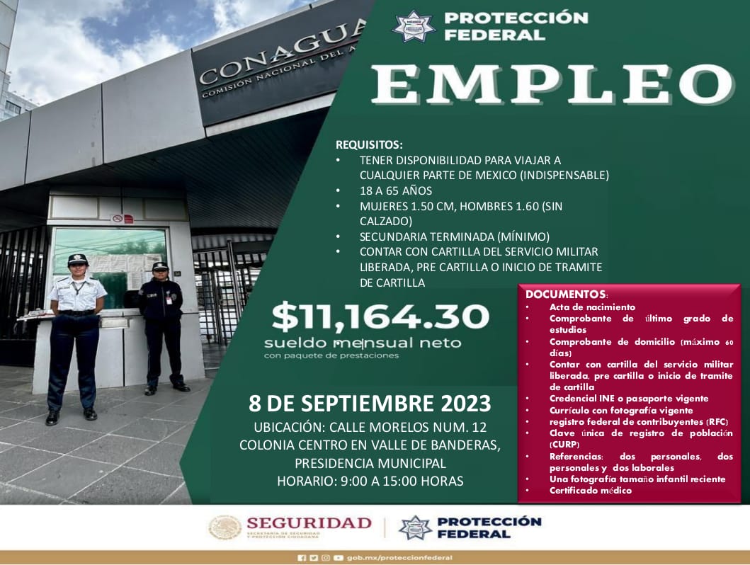El Servicio de Protección Federal invita a unirse a sus filas. Quienes estén interesados deberán tener entre 18 y 65 años de edad, contar con estudios mínimos de secundaria concluida, sin tatuajes visibles, en el caso de las mujeres contar con una estatura mínima de 1.50 m y 1.60 m para los hombres y en su caso contar con la cartilla del Servicio Militar liberada o en trámite.
