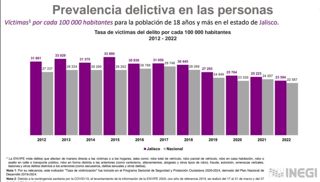 De acuerdo con la Encuesta Nacional de Victimización y Percepción sobre Seguridad Pública, Jalisco, registra una de las cifras más bajas en número de víctimas afectadas por determinados delitos, de los últimos once años, confirma el Instituto Nacional de Estadística y Geográfica, al destacar que esto pudo constatarse en informes vertidos por hogares y familias.