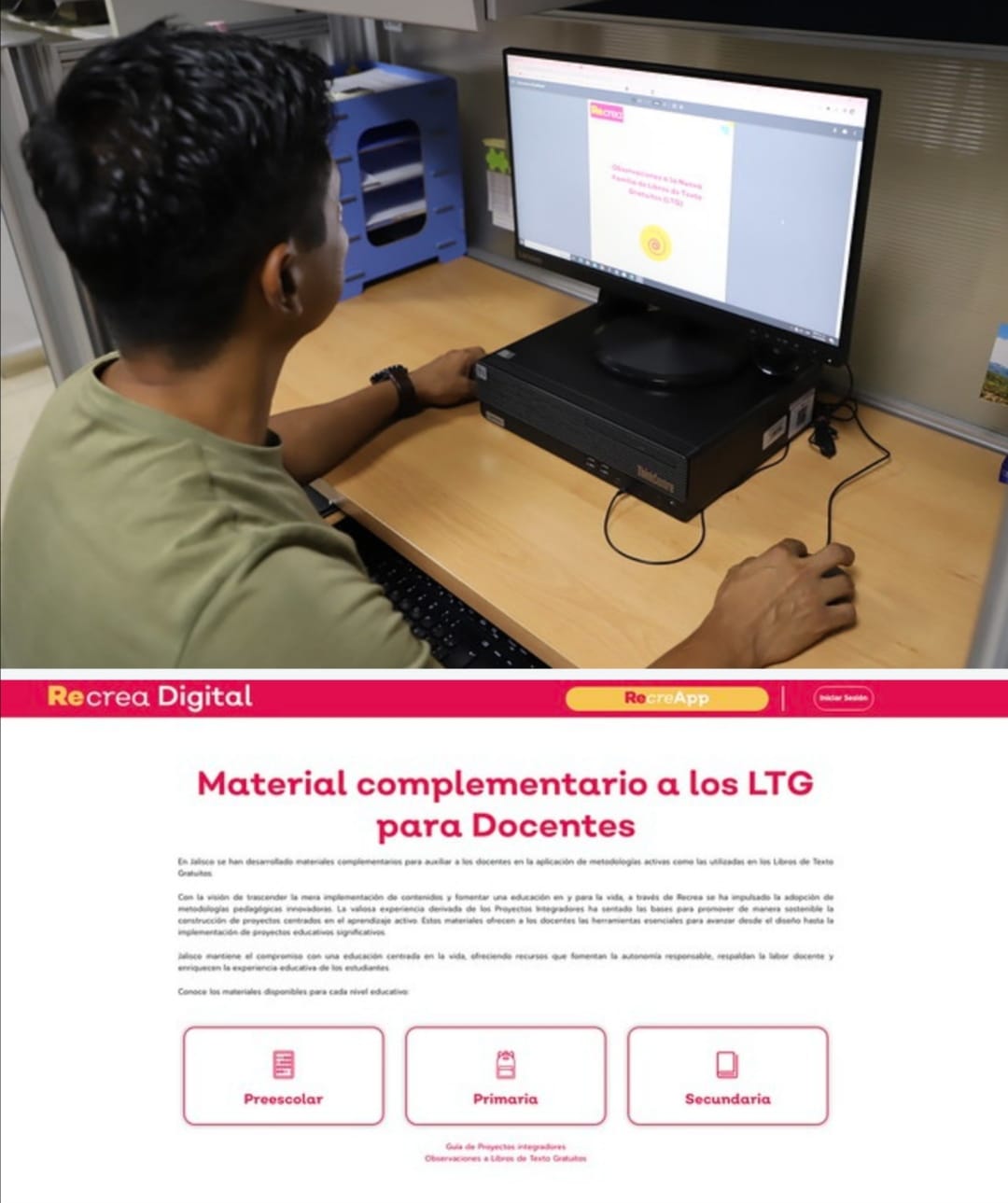 Material Complementario para docentes de educación preescolar, primaria y secundaria, se puede consultar  directo  en : https://recreadigital.jalisco.gob.mx/docentes/  o ingresar a Recrea Digital: https://recreadigital.jalisco.gob.mx  clic en Personal SEJ /  clic en Docentes.
