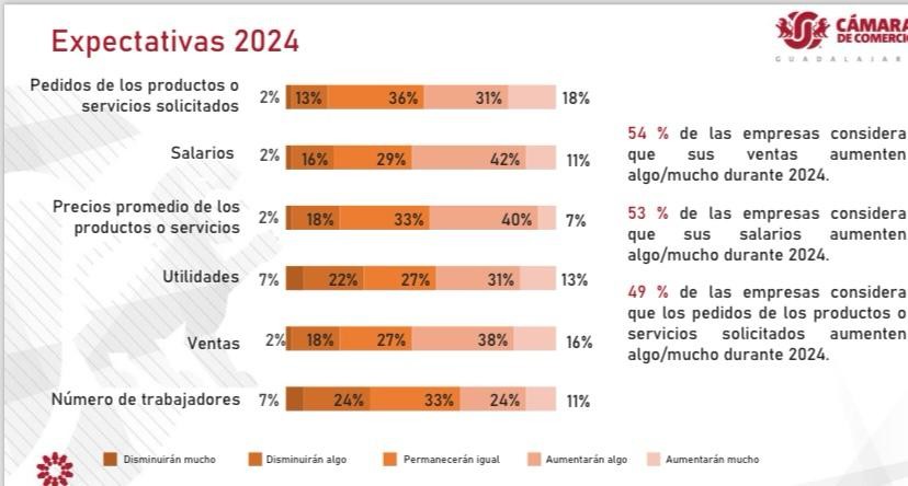 Considerando que los niveles de productividad y movimiento comercial durante este año, para mayoría de las más de 300 mil empresas, desde micro, pequeñas y medianas en Jalisco, fueron positivos y de recuperación respecto a 2020 y 2021, mitad de ellas, espera que sus ventas en 2024, rebasarán el 30 por ciento, afirma la CANACO Guadalajara, basada en estudio sobre expectativas económicas .